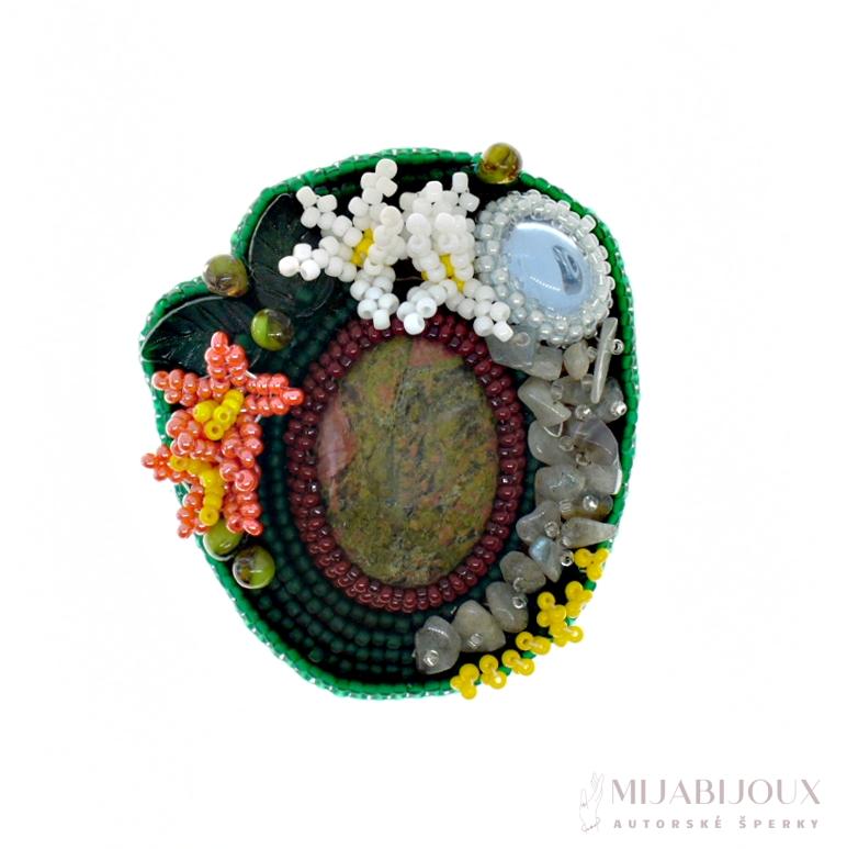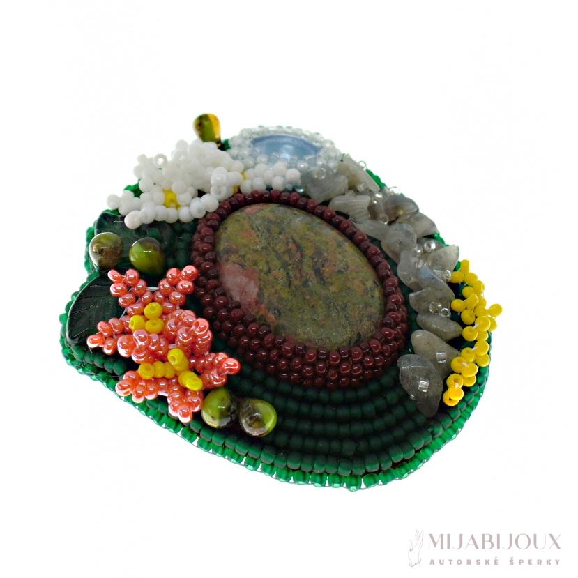 Brož tvoří obšitý unakit zasazený do květinkového rámce se zlomky z labradoritu a modrého skleněného kabošonku.