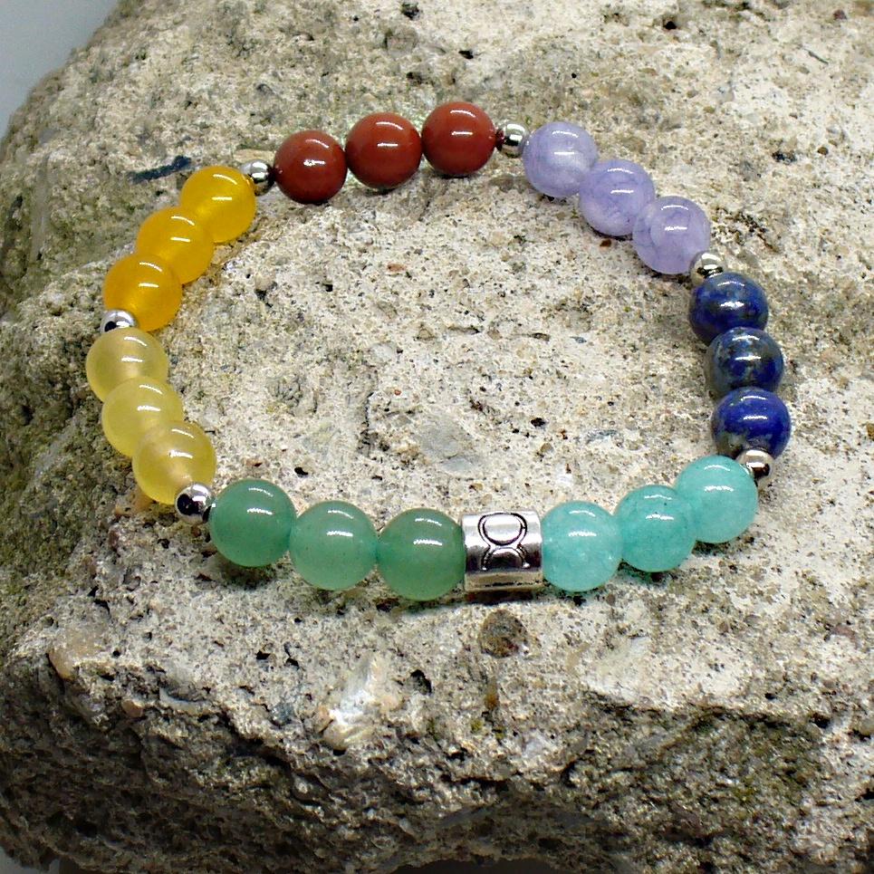 Čakrový náramek je vytvořený z přírodních minerálů modrého chalcedonu, lapisu lazuli, amazonitu, zeleného avanturínu, jadeitu, žlutého chalcedonu a červeného jaspisu. Tento čakrový náramek je speciálně vytvořený pro znamení Býka. Na náramek je přidaný kovový korálek z bižuterního kovu se znakem Býka. Minerály o velikosti 8 mm jsou navlečeny na pevném nylonovém lanku - pružence.