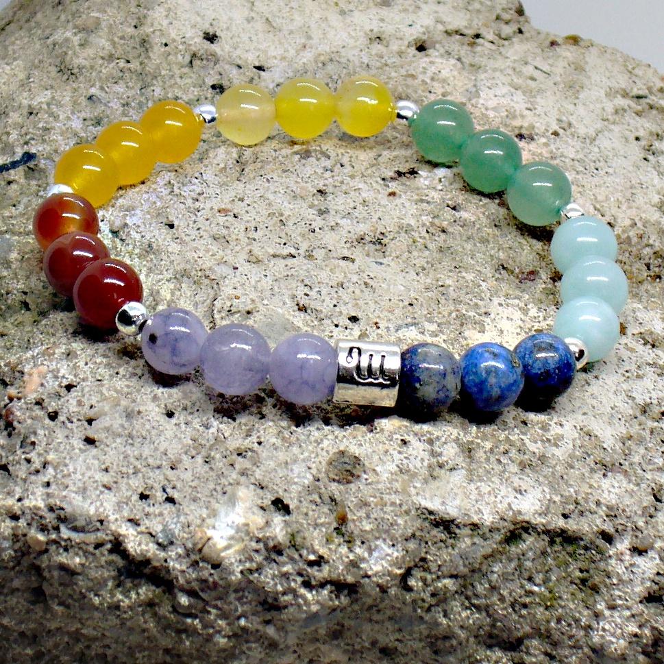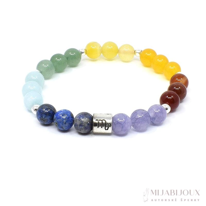 Náramek pro 7 čaker je vytvořený z přírodních minerálů modrého chalcedonu, lapisu lazuli, amazonitu, zeleného avanturínu, jadeitu, žlutého chalcedonu a karneolu. Tento čakrový náramek je speciálně vytvořený pro znamení Štíra. Na náramek je přidaný kovový korálek z bižuterního kovu se znakem Štíra. Minerály o velikosti 8 mm jsou navlečeny na pevném nylonovém lanku - pružence.