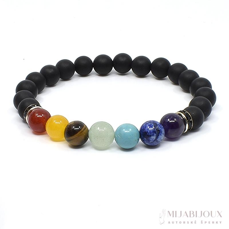 Náramky ze 7 čakrových barev a minerálů uklidňují a harmonizují energetická centra čaker. Čakrový náramek je vytvořený z přírodních minerálů onyxu, ametystu, lapisu lazuli, tyrkysu, zeleného avanturínu, tygřího oka, jadeitu a karneolu. Minerály o velikosti 8 mm jsou navlečeny na pevném nylonovém lanku - pružence.