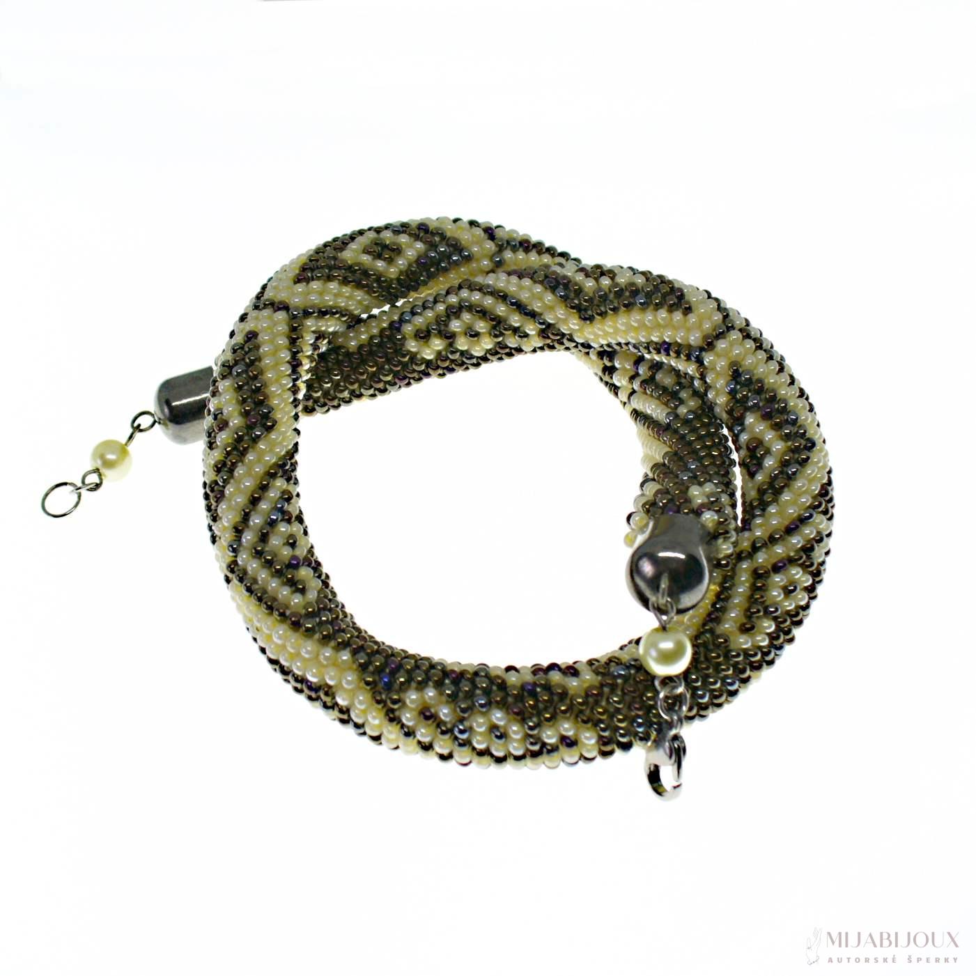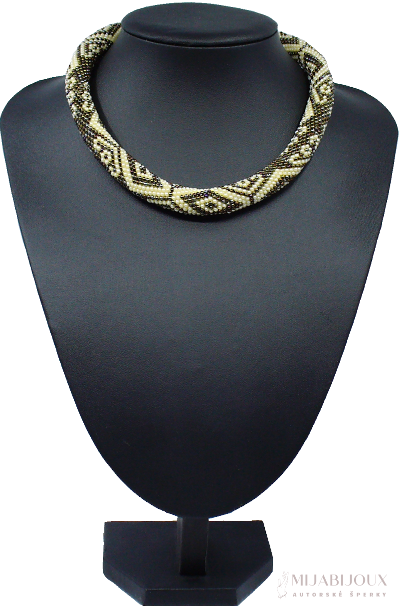 Nevšední, avšak velmi elegantní náhrdelník je uháčkovaný do geometrického vzoru z rokajlu Preciosa na 15 korálků dokola. Průměr dutinky činí jeden centimetr. Háčkovaný náhrdelník z malých korálů je univerzální šperk, který se hodí nejen ke společenským šatům, ale můžeme jej nosit k tričku a riflím.
