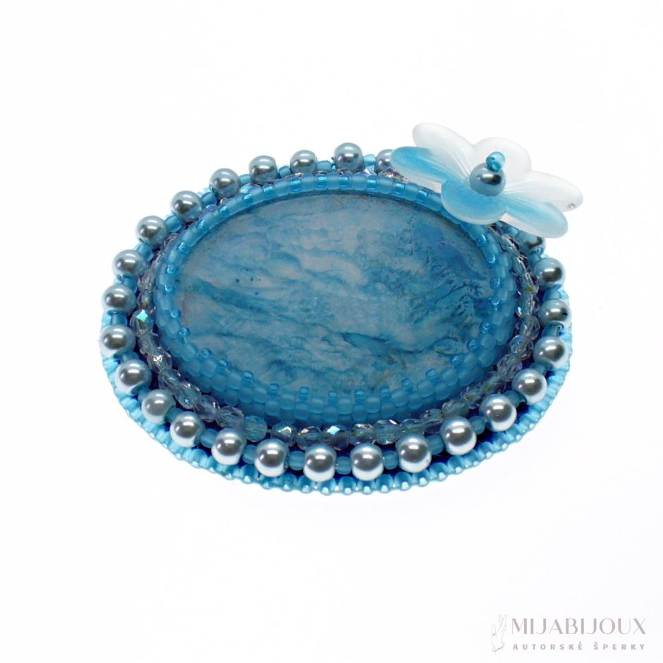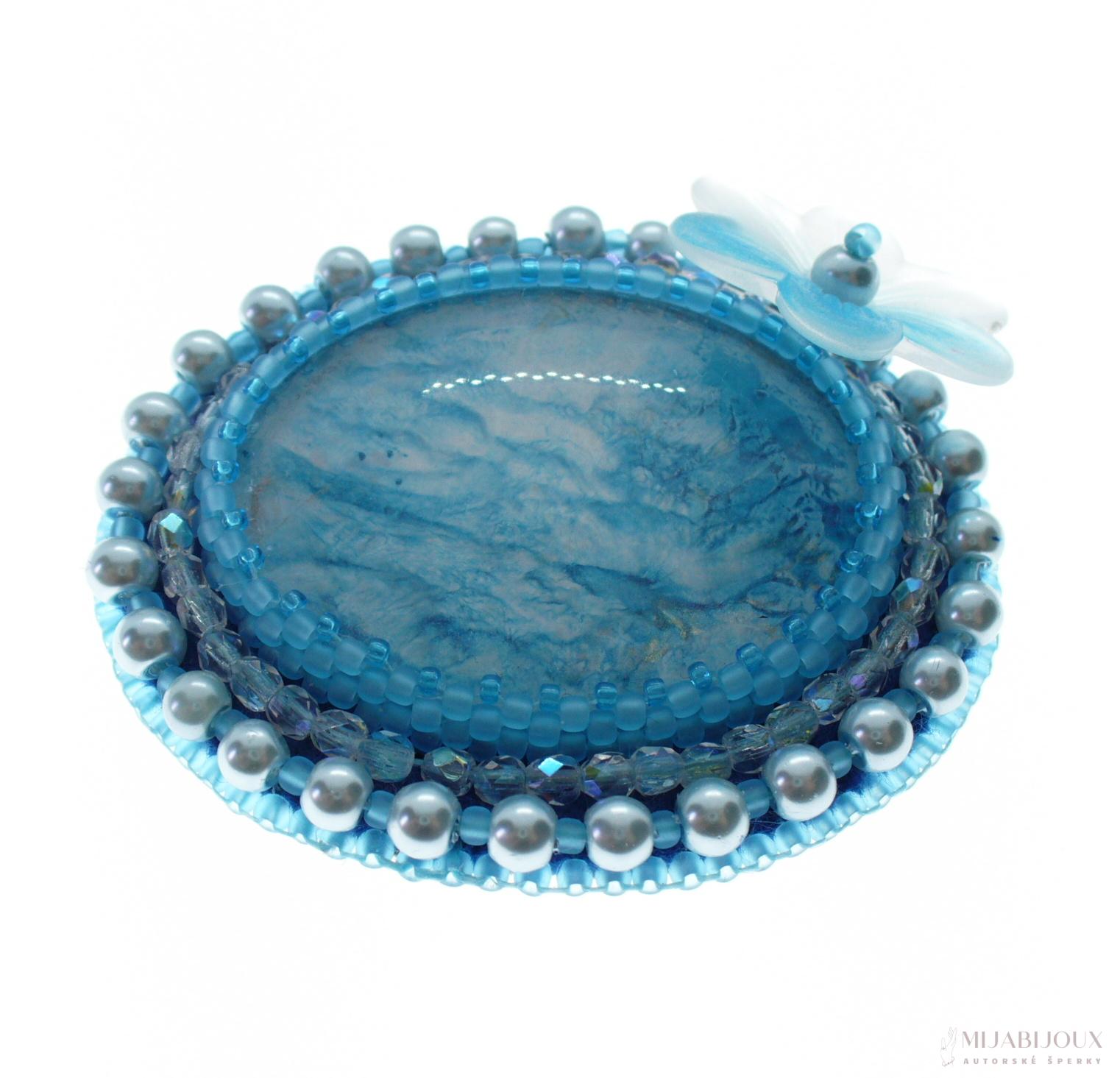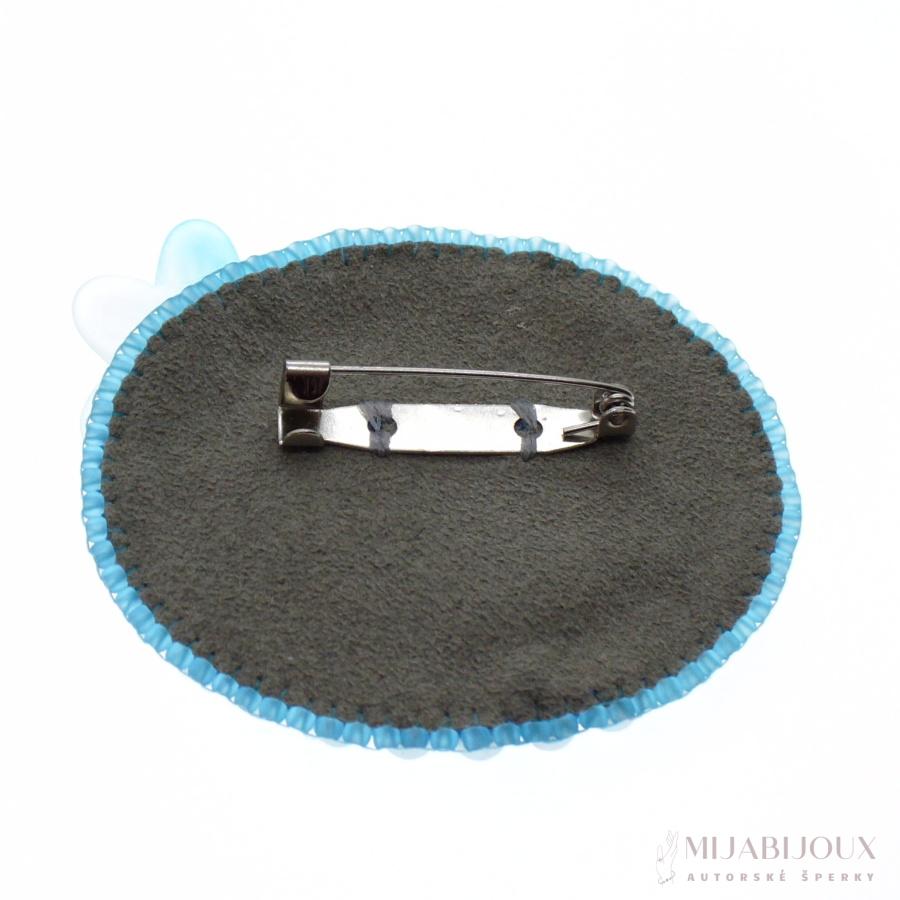 Tyrkysově modrá brož z malovaného kabošonu od Z-Art, který je obšitý japonským rokajlem Toho beads, skleněnými voskovanými perlami a skleněnými ohňovkami s pokovem.