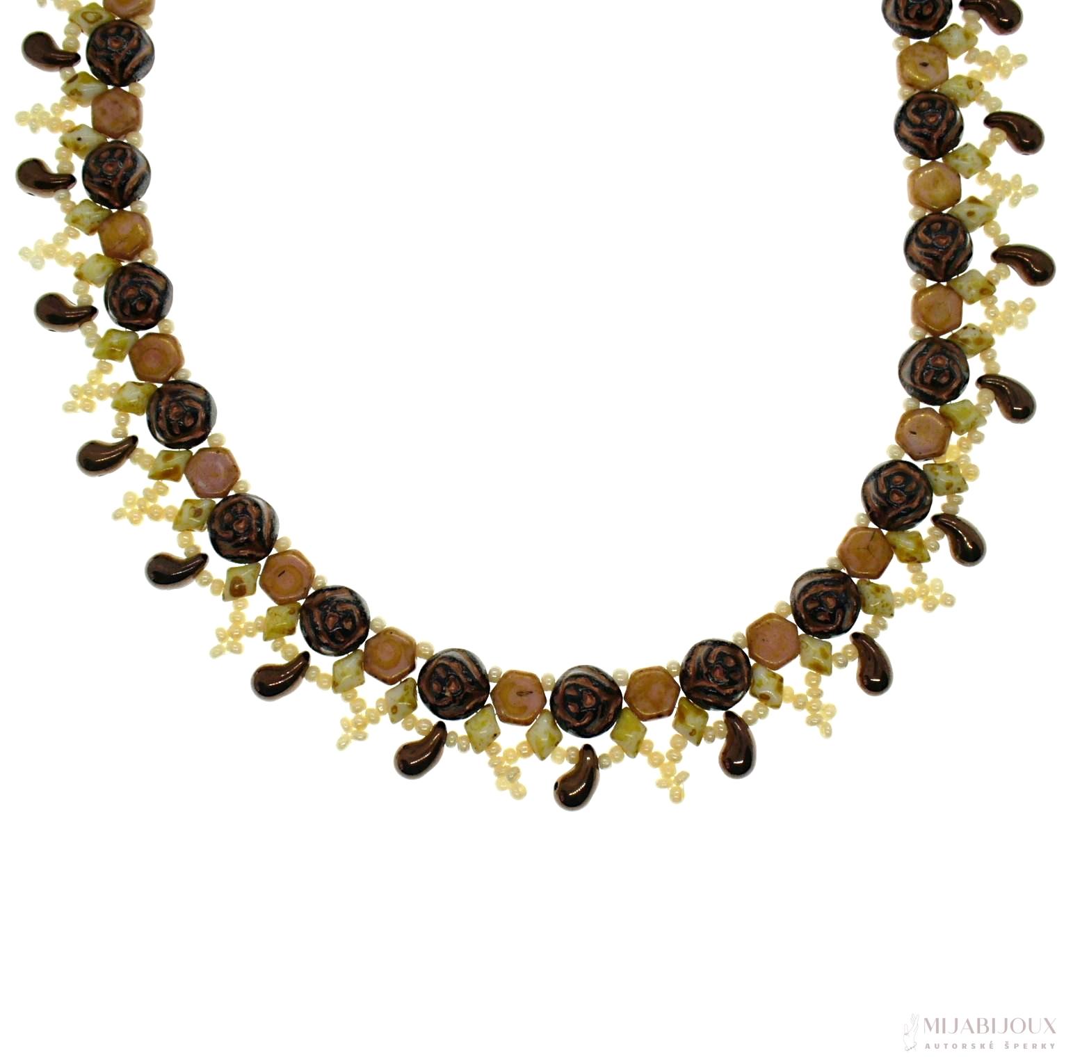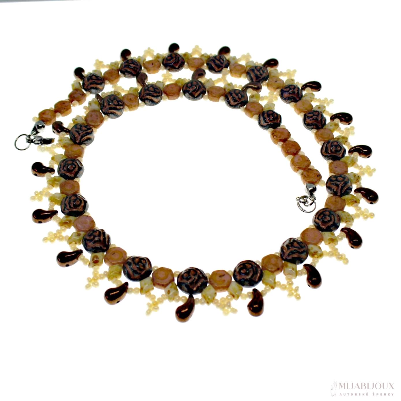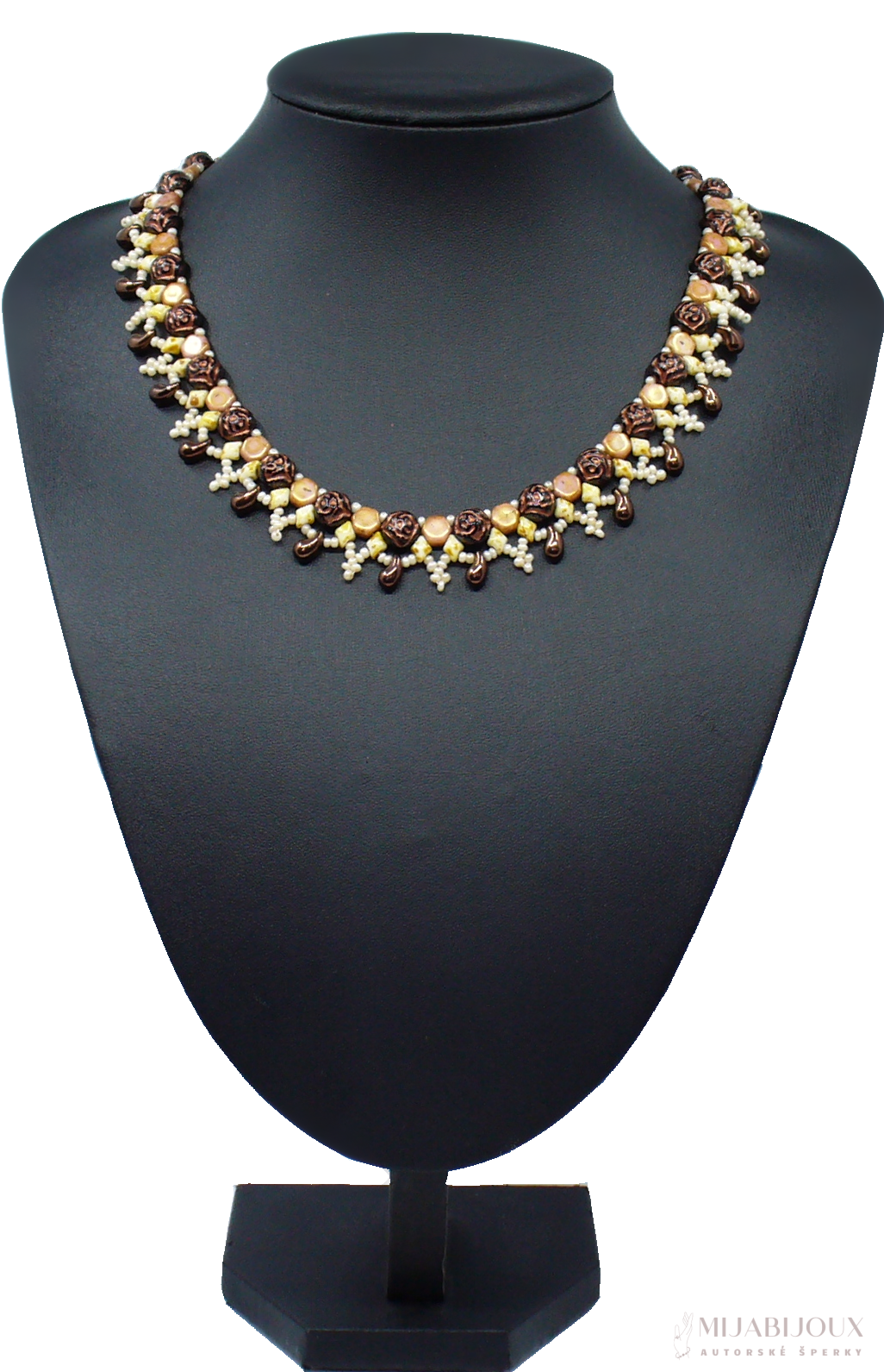 Autorský šperk. Náhrdelník je ručně ušitý z luxusních korálků vyrobených firmou Preciosa. Preciosa Candy Rose (novinka), Matubo Gemduo, dvoudírkové Zoliduo, Hexagon a rokajl.