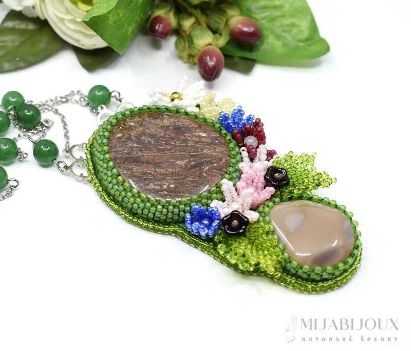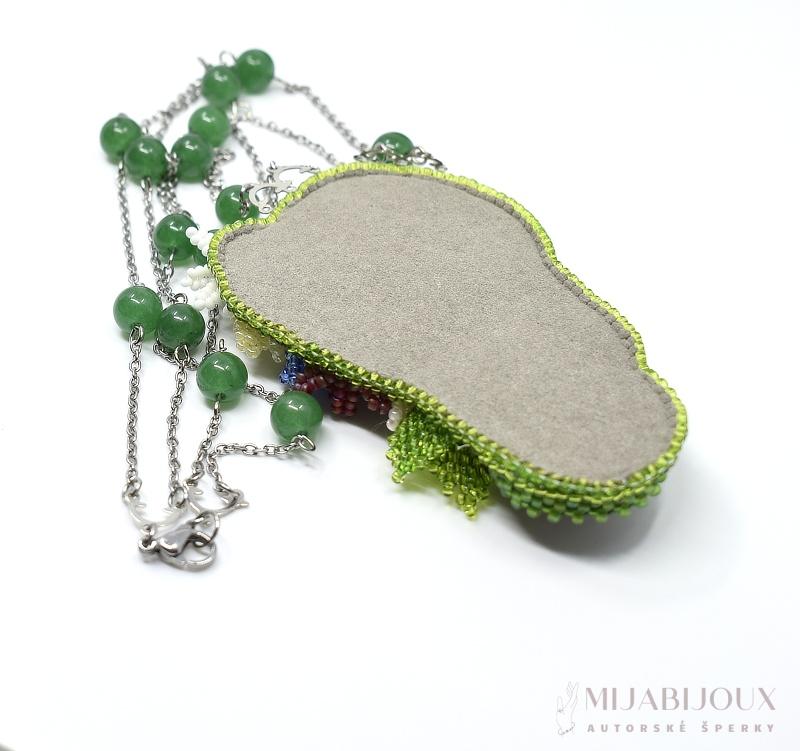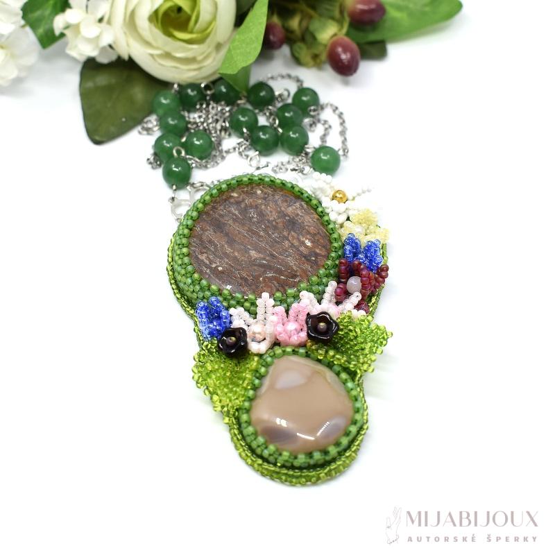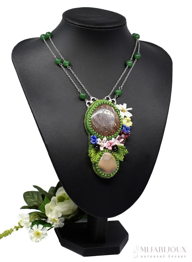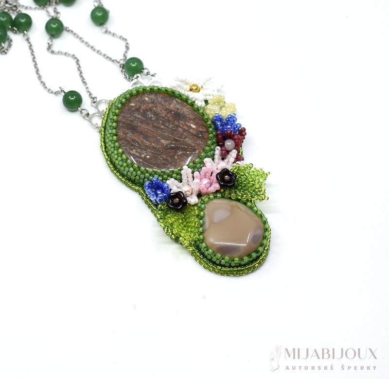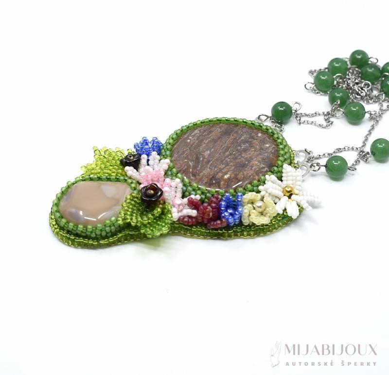 Originální autorský náhrdelník na téma rozkvetlá louka byl vytvořený časově náročnou technikou šitého šperku a korálkové výšivky. Minerál obrázkový jaspis a velký skleněný mačkaný korálek jsou obšité japonským rokajlem Toho beads a českým rokajlem Preciosa. Vše je bohatě dozdobeno šitými kytičkami a lístky, inspirovanými rozkvetlou loukou.