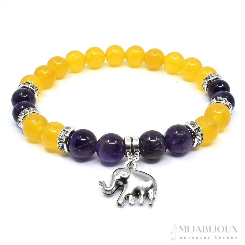 Náramek je ručně vyrobený z korálků přírodních minerálů žlutý jadeit a ametyst o velikosti 8 mm. Korálky z minerálů jsou navlečeny na pevnou nylonovou pruženku.