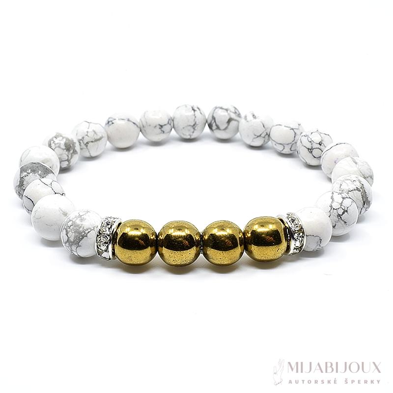 Náramek je vyroben z korálků přírodních minerálů hematit ve zlaté barvě a howlit o velikosti 8 mm. Polodrahokamy jsou navlečeny na pevném nylonovém lanku tzv. pružence.