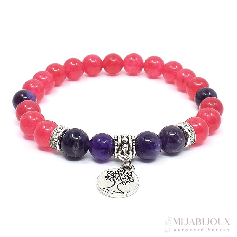 Náranek je vytvořený z korálků přírodích minerálů růžového jadeitu (jadeit rose pink) a ametystu o velikosti 8 mm. Korálky jsou navlečeny na kvalitní nylonové pružence. Náramek je dozdobený šatonovými rondelkami z bižuterního kovu v bílém provední a přívěskem "Strom života" z bižuterního kovu v úpravě starostříbro.