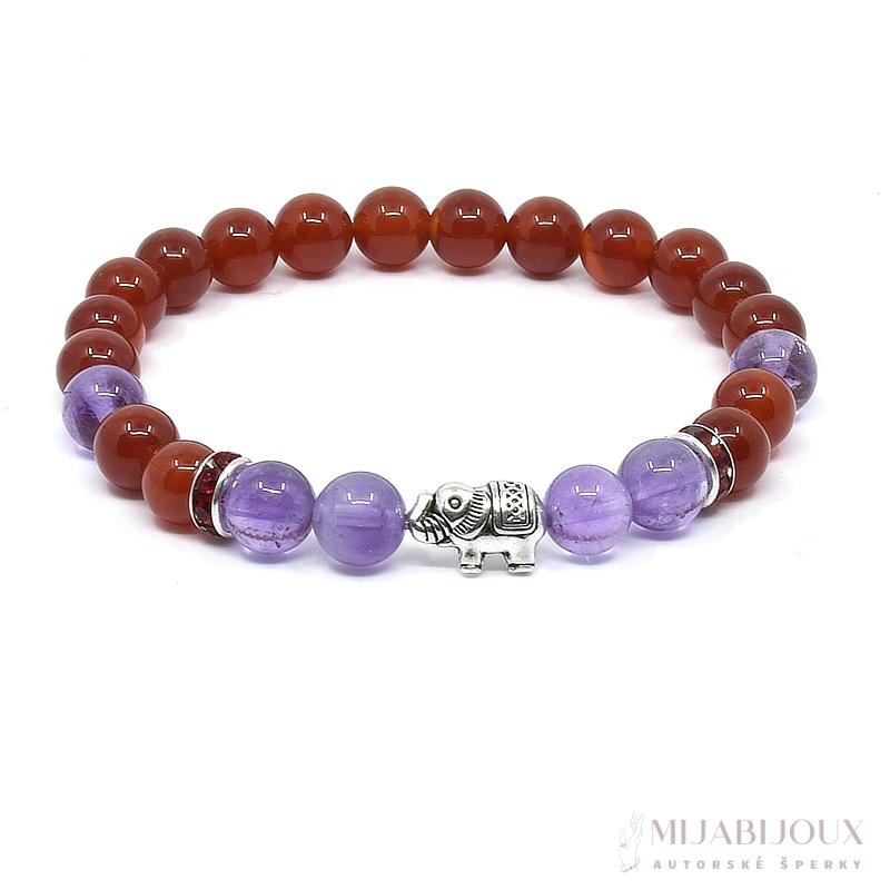 Náramek z přírodních minerálů karneol a ametys. Korálky z minerálů o velikosti 8 mm jsou navlečeny na pevnou nylonovou pruženku.