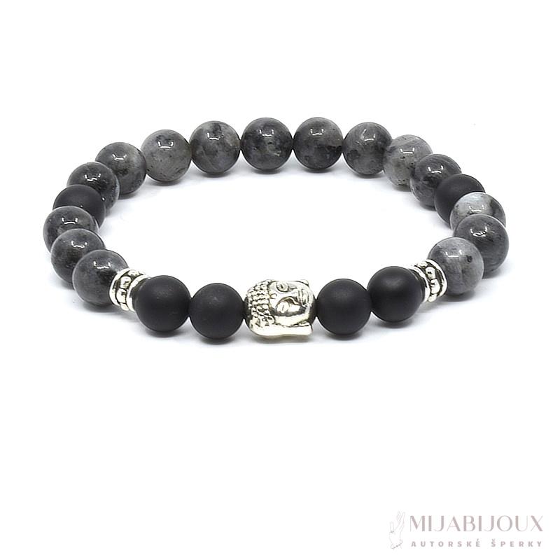 Náramek je ručně vyrobený z korálků přírodních minerálů labradorit a onyx o velikosti 8 mm. Minerály jsou navlečeny na pevnou nylonovou pruženku.
