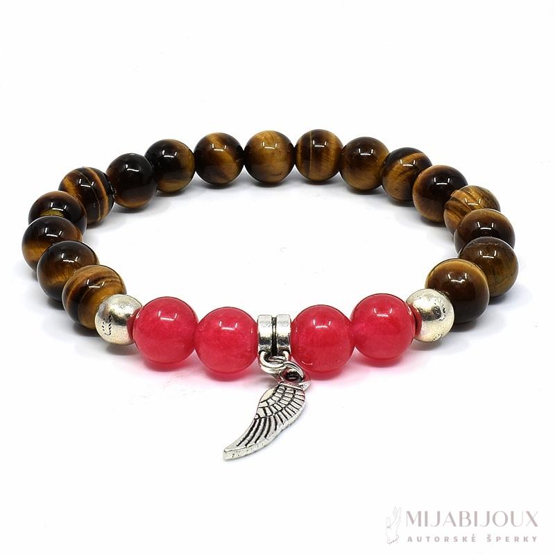 Náramek je ručně vyrobený z korálků přírodních minerálů tygřího oka a růžového jadeitu o velikosti 8 mm. Ke korálkům z minerálů jsou přidány kovové korálky a přívěsek ve tvaru andělského křídla. Vše v provedení starostříbro.