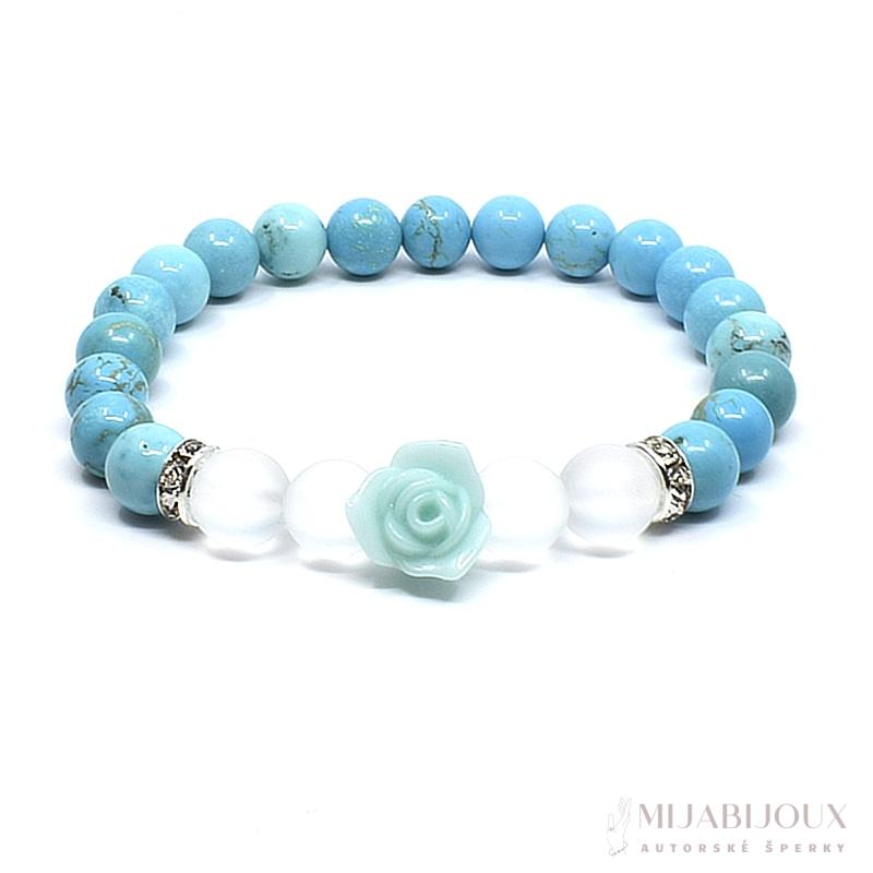 Náramek z minerálů je doplněný kytičkou v modré barvě a šatonovými rondelkami v čirém provedení.