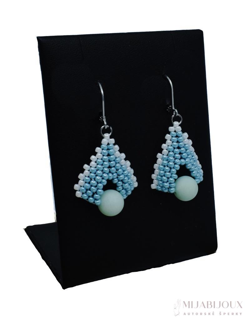 Visací náušnice vyrobené technikou šití z korálků. Korálky z přírodního amazonitu jsou vkomponovány do šitého motivu z českého rokajlu Preciosa a Toho v barvě modré a bílé.