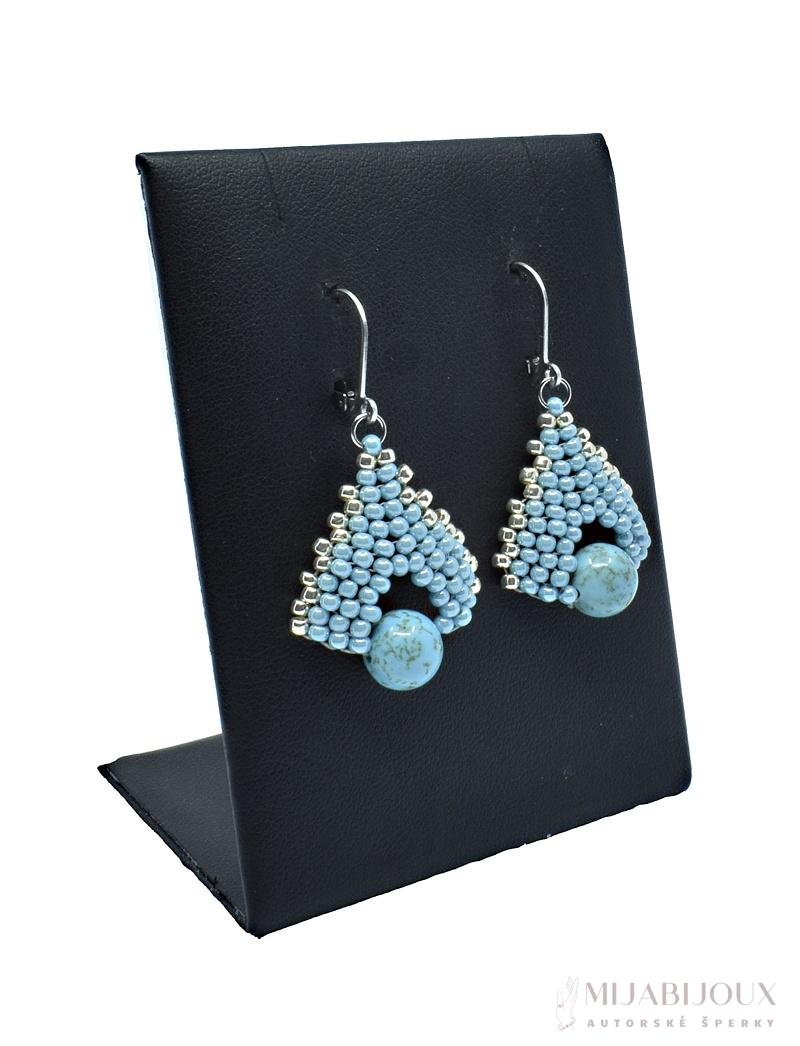 Efektní náušnice vyrobené technikou šití z korálků. Korálky z přírodního tyrkysu jsou vkomponovány do šitého motivu z českého rokajlu Preciosa a Toho v barvě modré a zlaté.