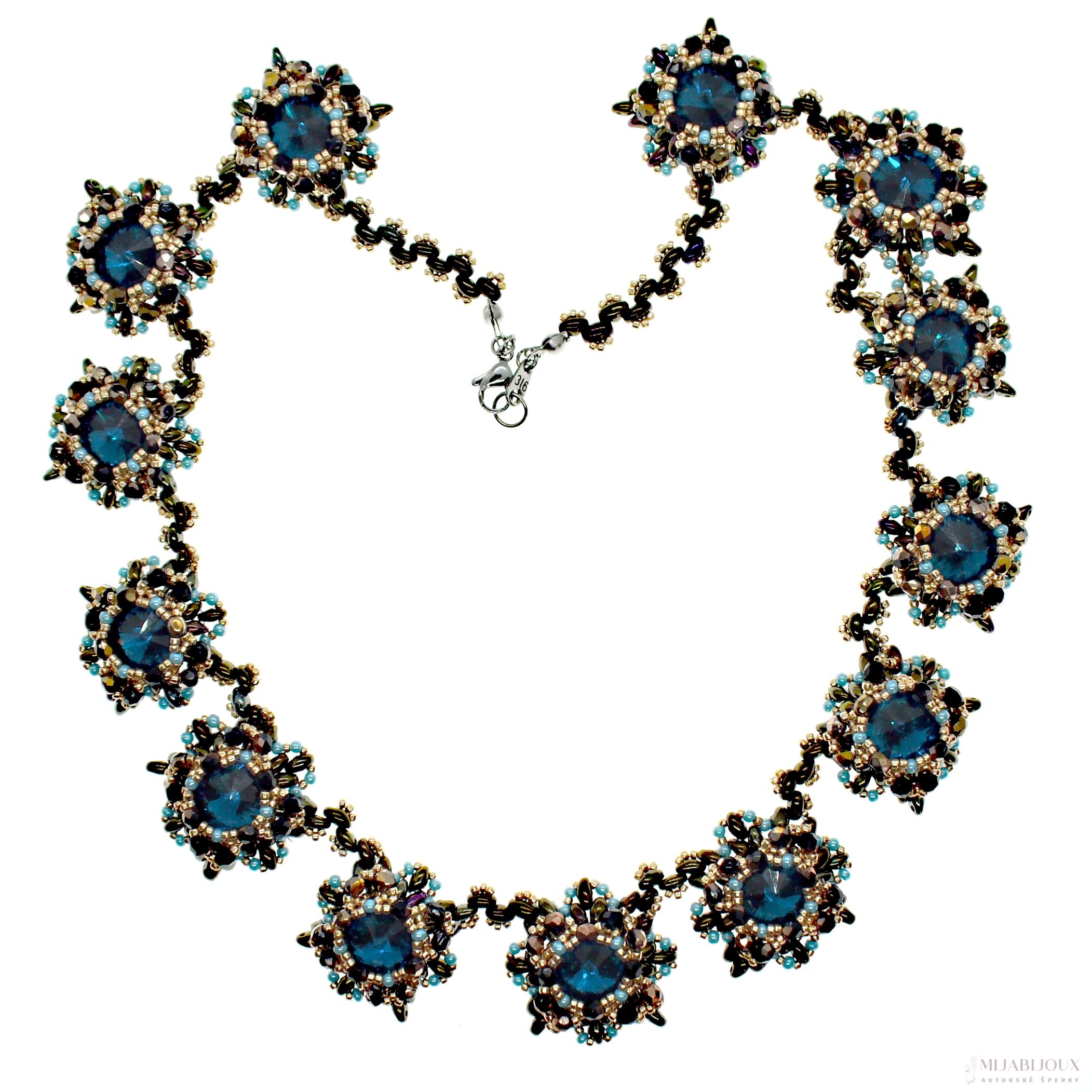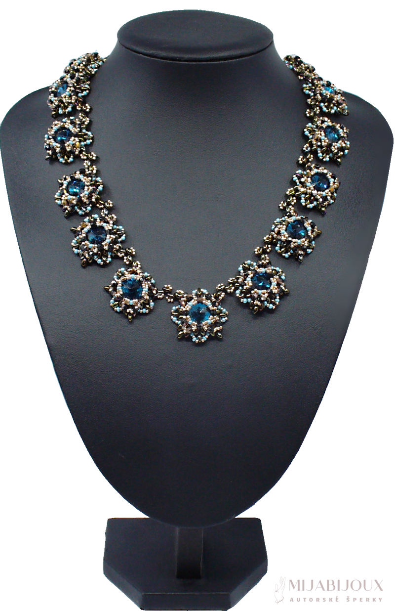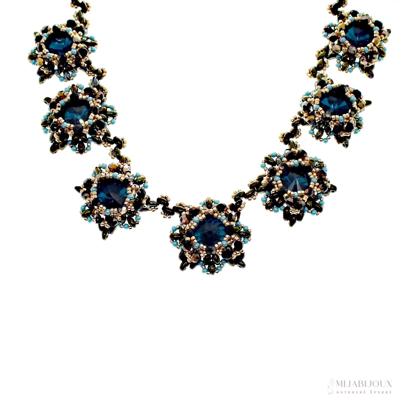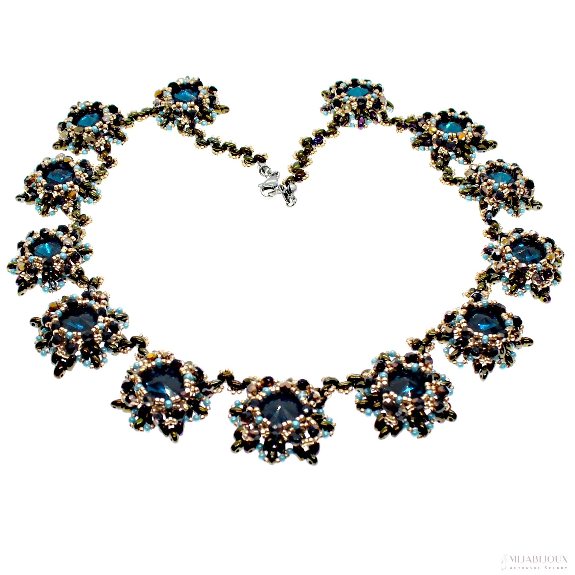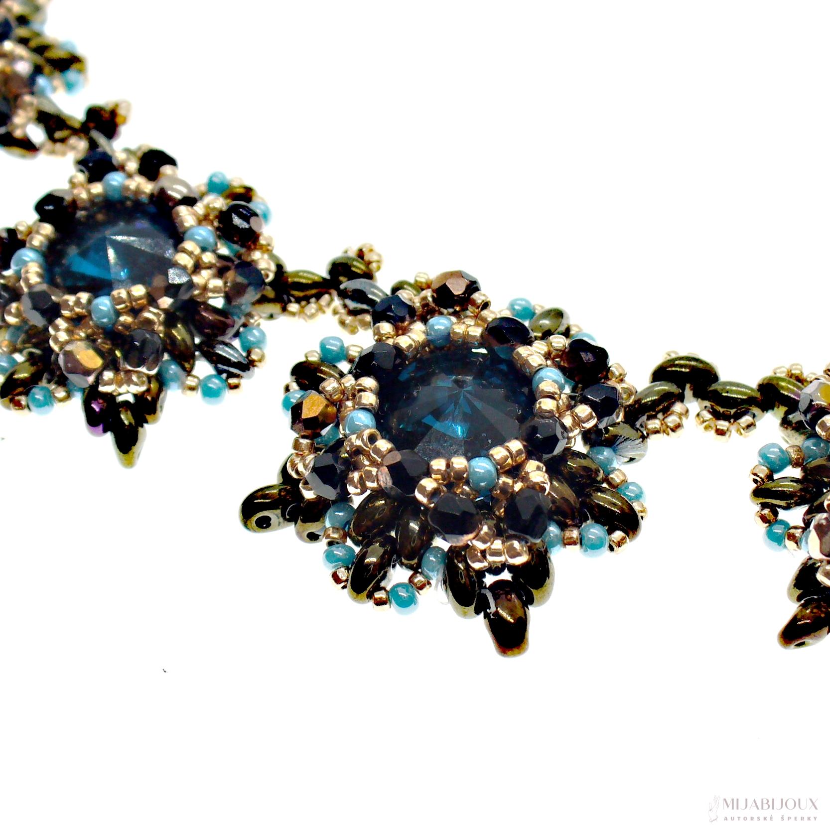 Nebojte se vyniknout! Nabízíme luxusní autorský a originální šperk. Společenský náhrdelník z Matubo rivoli. Každá rivolka je obšitá japonským rokajlem Toho Beads, skleněnými ohňovkami s pokovem, rokajlem Preciosa a dvoudírkovými korálky Preciosa Twin v úpravě hnědý iris. Obšité Matubo rivolky jsou k sobě sešity pevnou splétanou šňůrou Fireline Berkley.