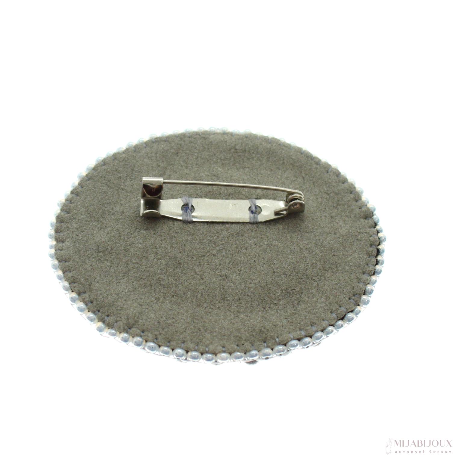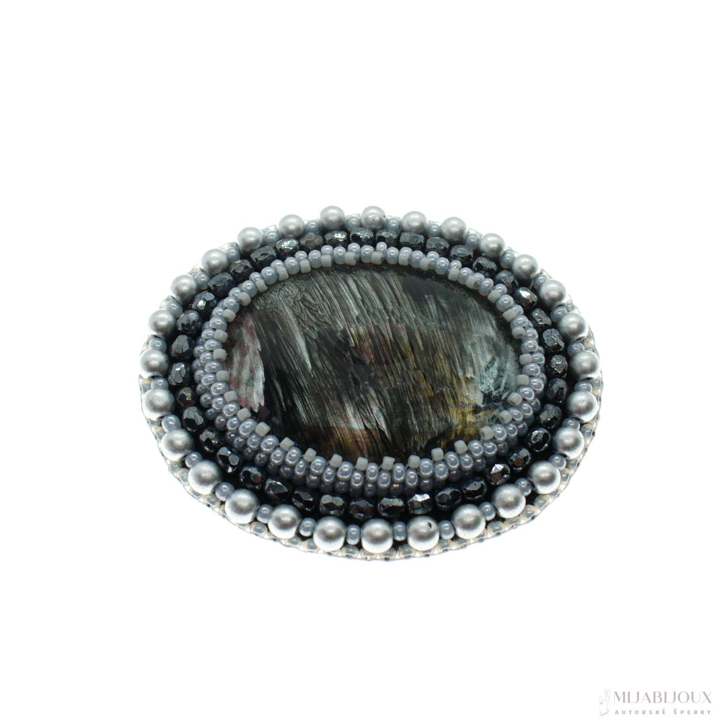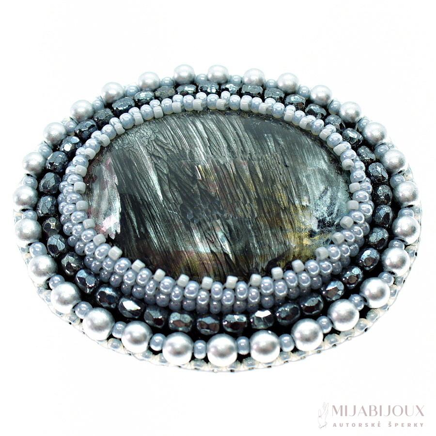 Šedá brož z malovaného kabošonu od Z-Art, který je obšitý japonským rokajlem Toho beads, českým rokajlem Preciosa, skleněnými voskovanými perlami a skleněnými ohňovkami s pokovem.