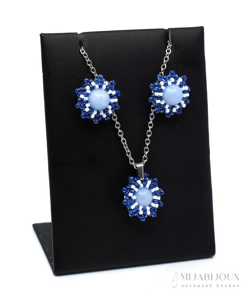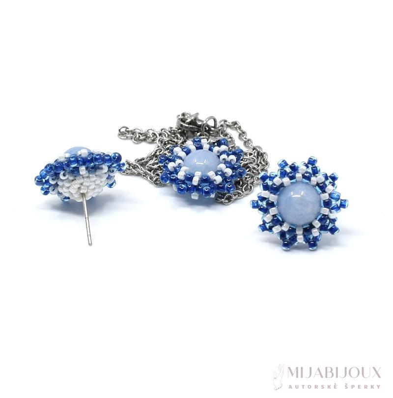 Souprava náušnic a náhrdelníku z minerálu modrý chalcedon. Korálky z chalcedonu jsou ručně obšity do tvaru kytičky japonským rokajlem Toho Round. Náušnice jsou našity na puzetky z chirurgické oceli.