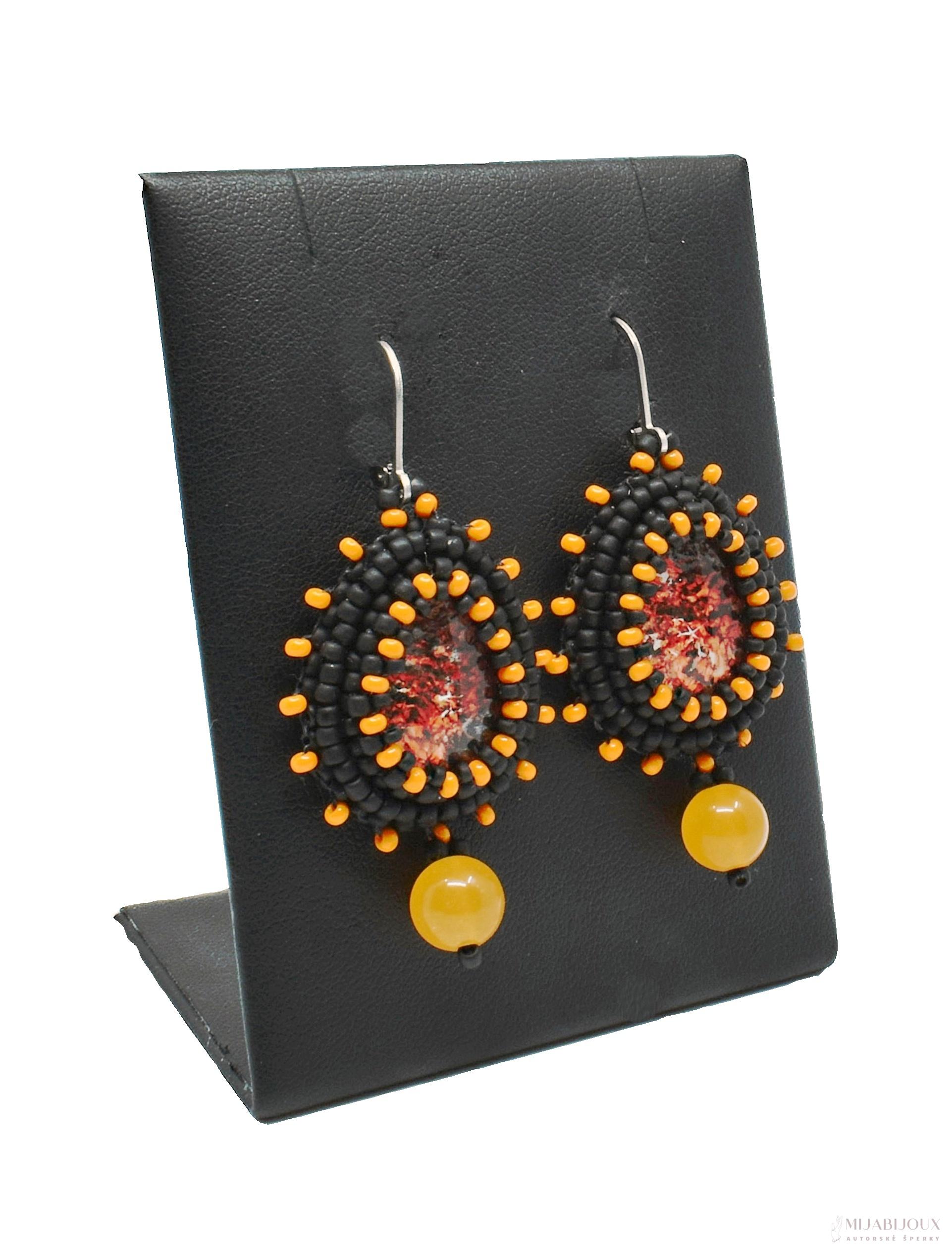Náušnice jsou vyrobeny ze skleněných kabošonů od Malované kabošony (Z-Art) v barvách oranžové a černé. Obšito japonským rokajlem Toho a českým rokajlem Preciosa. Přívěsky tvoří kuličky přírodního žlutého jadeitu.