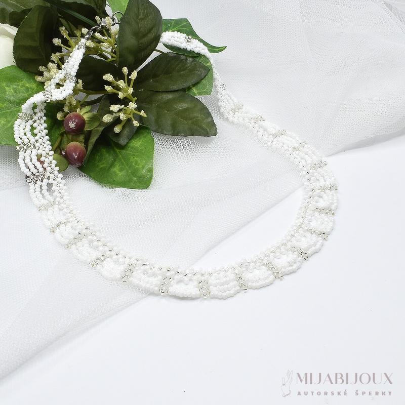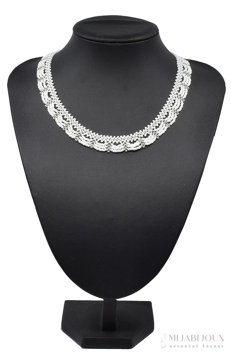 Jemný bílý náhrdelník je zhotovený technikou šitého šperku. Nestárnoucí klasický náhrdelník ve tvaru malého límečku je ušitý z českého rokajlu Preciosa bílé barvy a průhledného rokajlu se stříbrným průtahem. Límeček je ukončen zapínáním na karabinku a komponenty z chirurgické oceli.