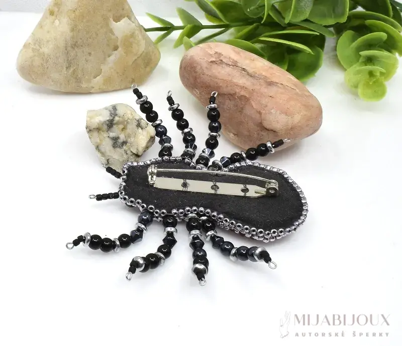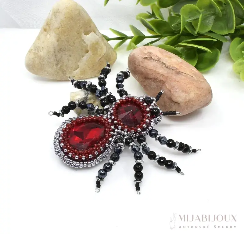 Tělo pavouka je vyrobeno ze třpytivého šatonu a červené matubo rivoli, které zajišťují dokonalý lesk. Šaton a rivoli jsou našité na filcový podklad a obšité japonským rokajlem Toho Round ve stříbrné a červené úpravě. Nohy pavouka jsou tvořeny z bižuterního drátku a drobných korálků v černé barvě. Zapínání je na brožový můstek z bižuterního kovu.