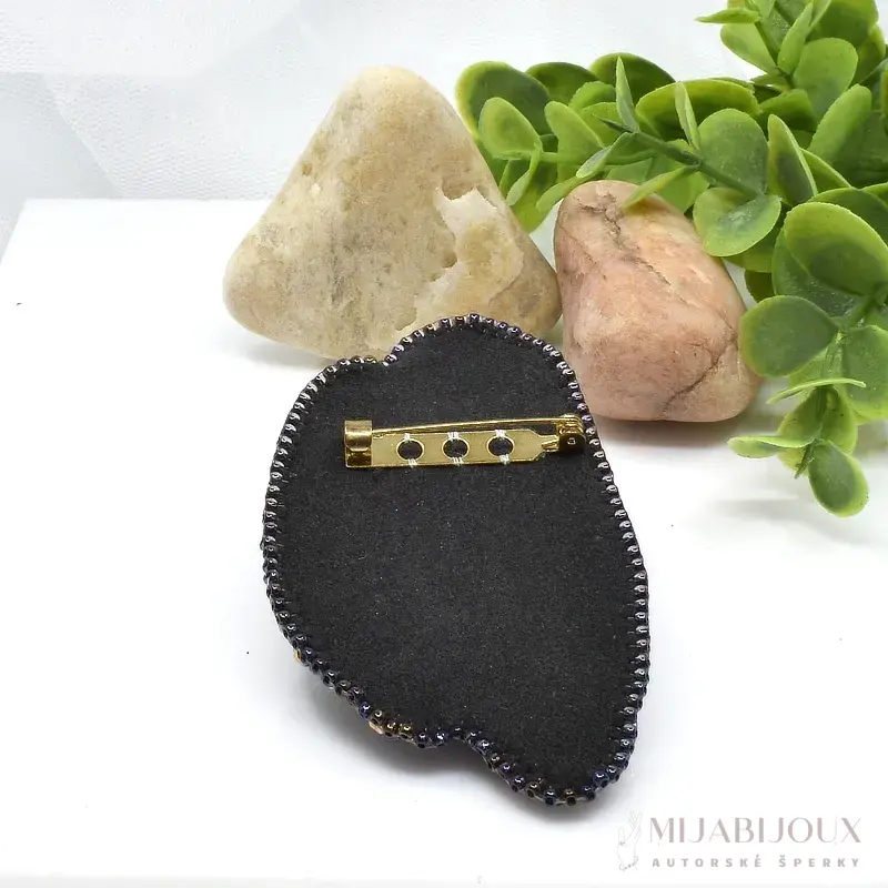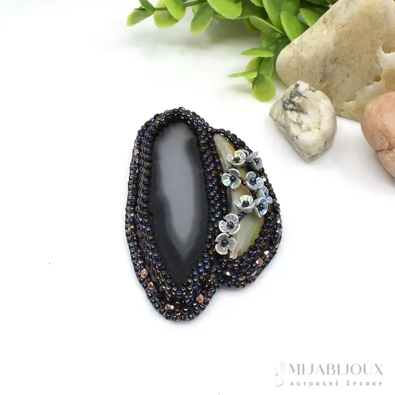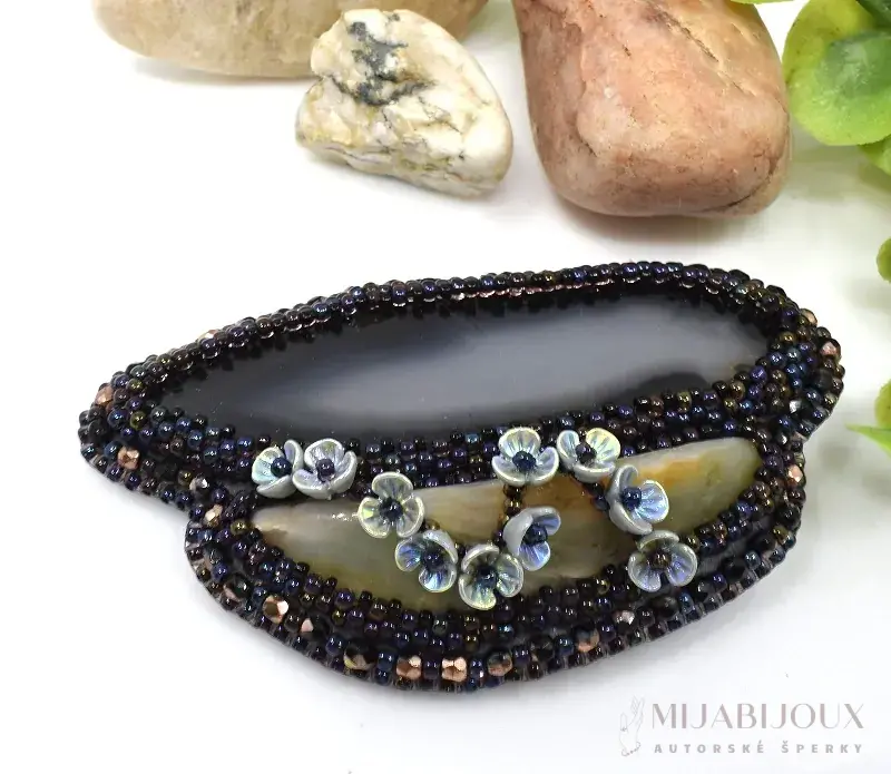 Elegantní brož z šedého plátku achátu a úlomkem perleťové mušle. Achát s mušlí jsou obšité rokajlem Preciosa v úpravě modrý iris a broušenými korálky s efektem pokovu. Mušle je dozdobená malými kytičkami v šedé barvě s modrým lesklým efektem. Originální brož, která bude dokonalým doplňkem ke každému outfitu.