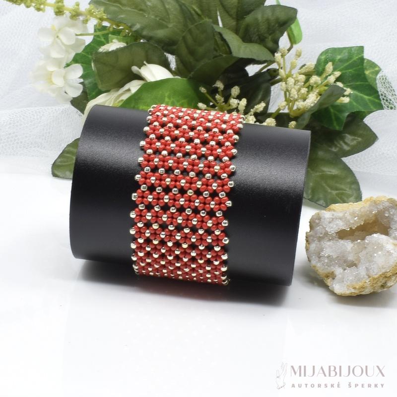 Elegantní červený náramek z korálků, ručně vyráběný technikou šití z korálků, je perfektním doplňkem pro každou příležitost. Precizní práce z drobných červených a zlatých rokajlových korálků vytváří jemný vzor, který podtrhne váš styl a dodá outfitu jedinečný šmrnc. Tento ručně šitý náramek nejen zaujme výraznou barvou, ale také představuje kvalitu a péči, se kterou byl vytvořen. Skvěle se hodí jako dárek nebo jako krásný kousek do vaší šperkovnice.
