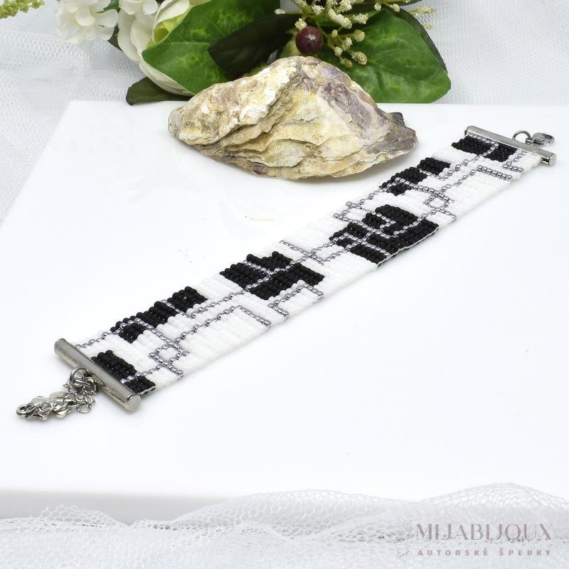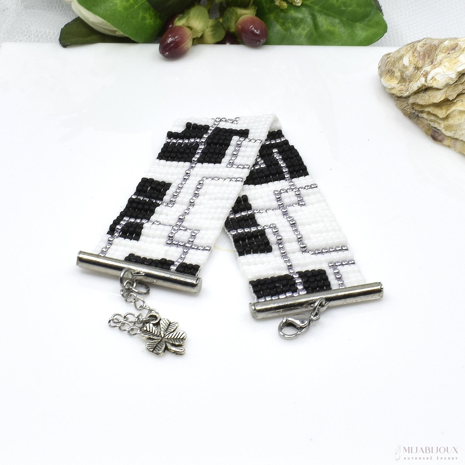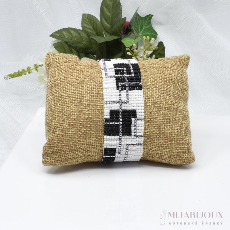 Tento masivní tkaný náramek z japonských drobných korálků Toho v barvách bílé, černé a zlaté doporučujeme těm, kteří hledají jedinečný a luxusní doplněk, jež vyčnívá svým designem a kvalitou. Vytváří pro jeho nositele pocit luxusu a výraznosti.
