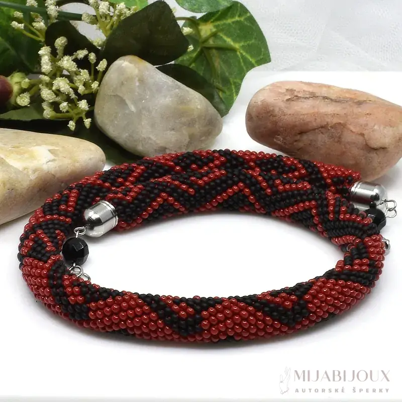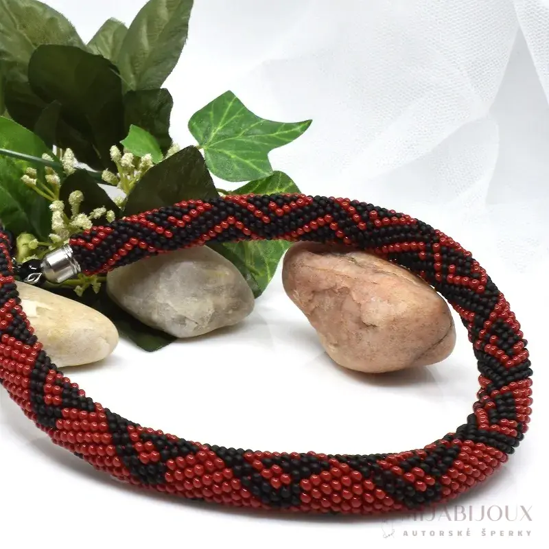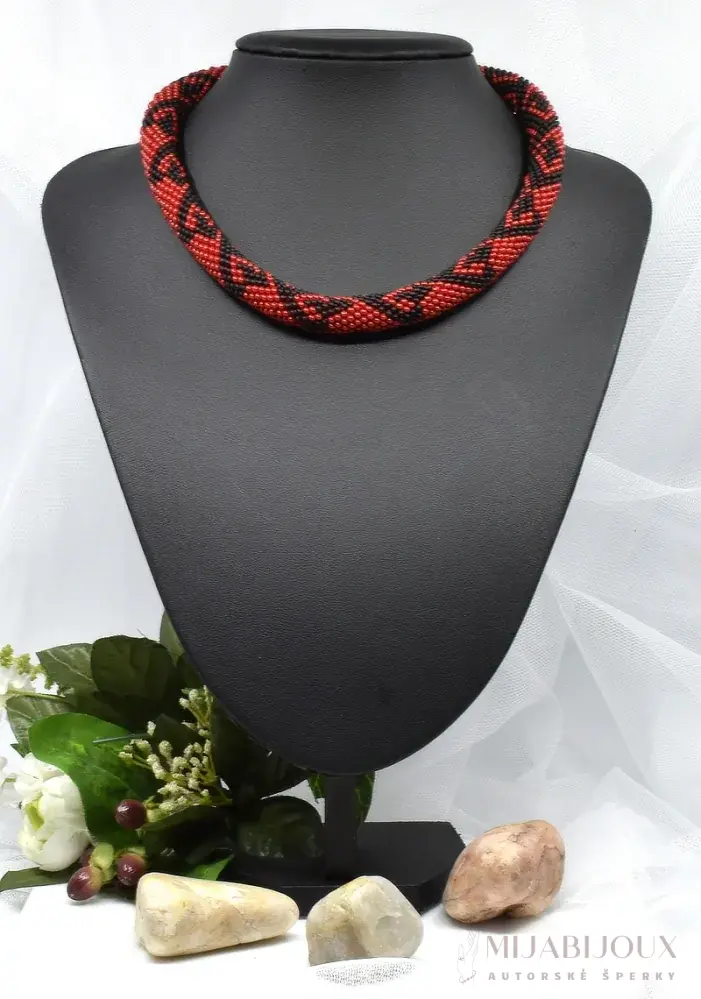 Nevšední, avšak velmi elegantní náhrdelník je uháčkovaný do geometrického vzoru z rokajlu Preciosa na 12 korálků dokola. Průměr dutinky je cca 9 mm. Háčkovaný náhrdelník z malých korálů je univerzální šperk, který se hodí nejen ke společenským šatům, ale můžeme jej nosit k tričku a riflím.