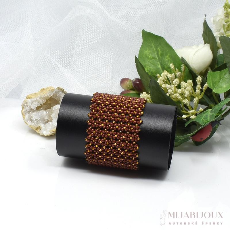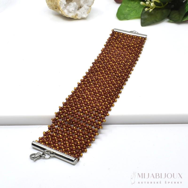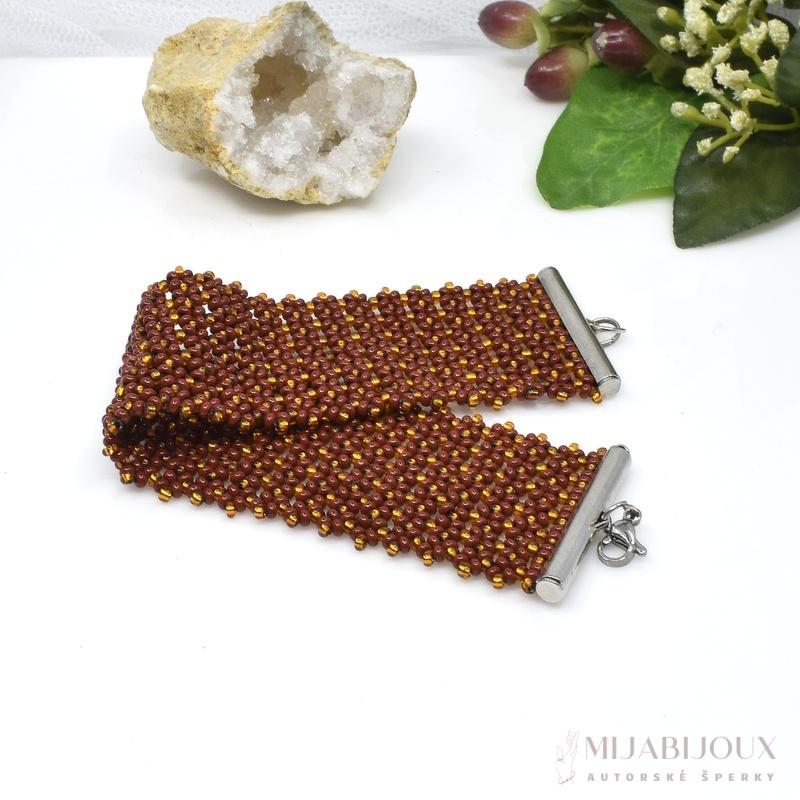 Elegantní hnědý široký náramek z korálků, ručně vyráběný technikou šití z korálků, je perfektním doplňkem pro každou příležitost. Precizní práce z drobných červených a zlatých rokajlových korálků vytváří jemný vzor, který podtrhne váš styl a dodá outfitu jedinečný šmrnc. Tento ručně šitý náramek nejen zaujme svou barevnou kombinací, ale také představuje kvalitu a péči, se kterou byl vytvořen. Skvěle se hodí jako dárek nebo jako krásný kousek do vaší šperkovnice.
