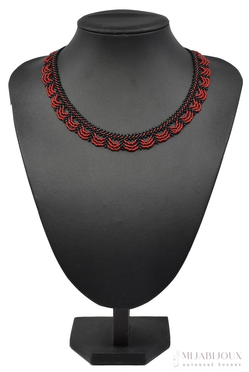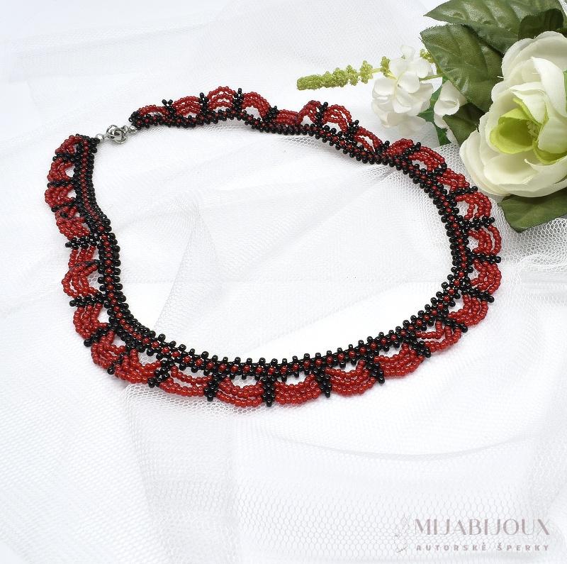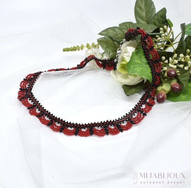 Jemný náhrdelník je zhotovený technikou šitého šperku. Nestárnoucí klasický náhrdelník ve tvaru malého límečku je ušitý z českého rokajlu Preciosa červené a černé barvy. Límeček je ukončen zapínáním na karabinku a komponenty z chirurgické oceli.