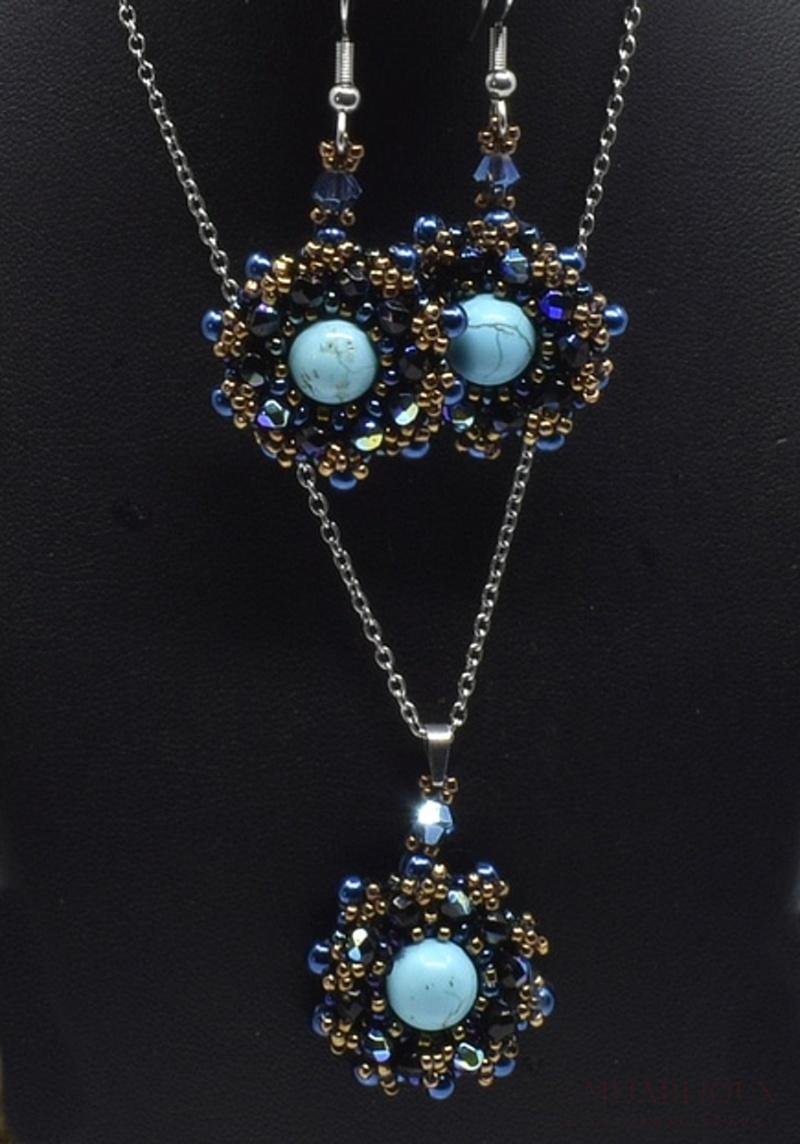 Elegantní sada šperků z tyrkenitu, zahrnující náušnice a náhrdelník, vyrobená technikou ručního šití z korálků, s použitím modrých a zlatých korálků. Tyto šperky kombinují křišťálově modrý tyrkenit s lesklým designem, ideální pro každodenní nošení i speciální příležitosti. Unikátní mandalový vzor dodává sadě sofistikovaný vzhled a přirozenou krásu. Skvělý dárek pro milovníky přírodních kamenů.