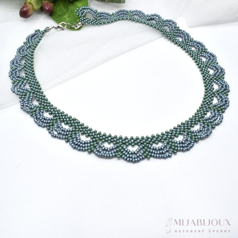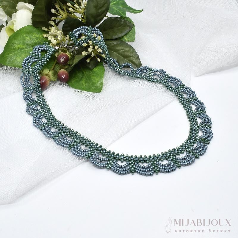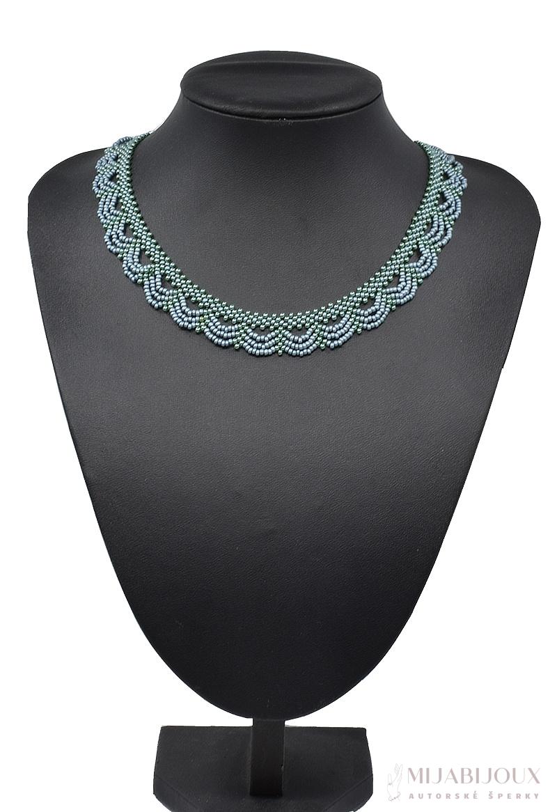 Elegantní jemný náhrdelník je zhotovený technikou šitého šperku. Nestárnoucí klasický náhrdelník ve tvaru malého límečku je ušitý z českého rokajlu Preciosa modré a modrozelené barvy. Límeček je ukončen zapínáním na karabinku a komponenty z chirurgické oceli.