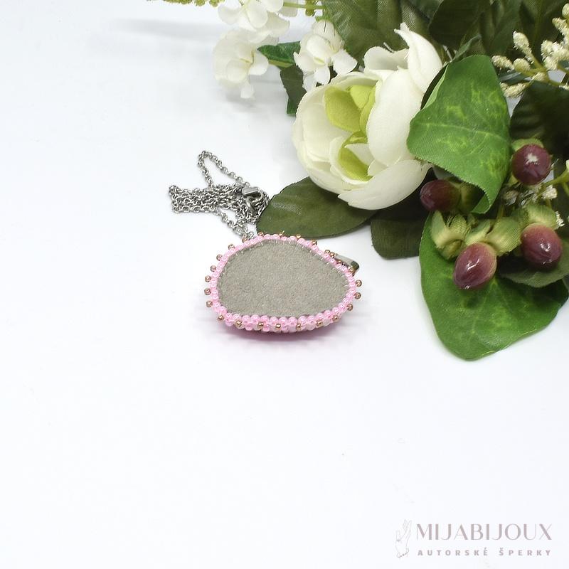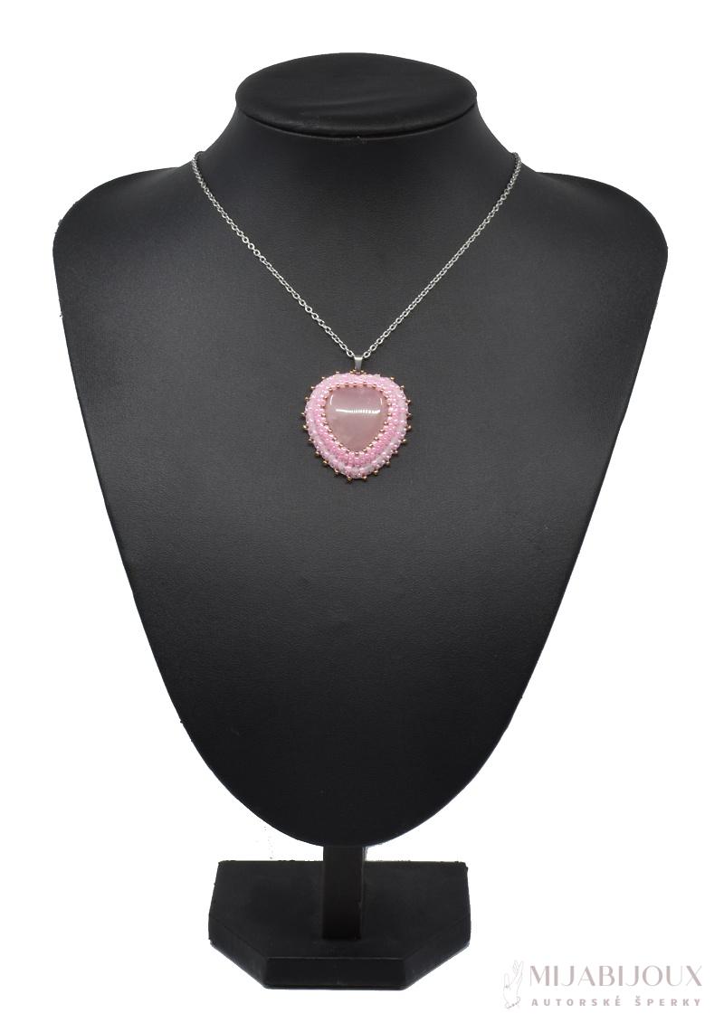 Náhrdelník z něžného růženínu ve tvaru srdce je vytvořený technikou šití a vyšívání z korálků. Přírodní minerál růženín je obšitý kvalitním japonským rokajlem Toho round. Minerál je našitý na filcový podklad a podšitý kvalitní umělou semiší Alcantara, která je na dekoltu velice příjemná.