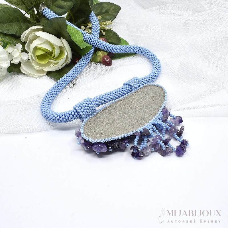 Náhrdelník je vytvořený technikou šití a háčkování z korálků z plátku přírodního achátu, zlomků přírodního ametystu a českého rokajlu Preciosa. Přívěsek je zavěšený na dutince háčkované z korálků, která je zakončena kaplíky z chirurgické oceli se zapínáním z chirurgické oceli, náhrdelník je tedy vhodný také pro alergiky na bižuterní kovy.