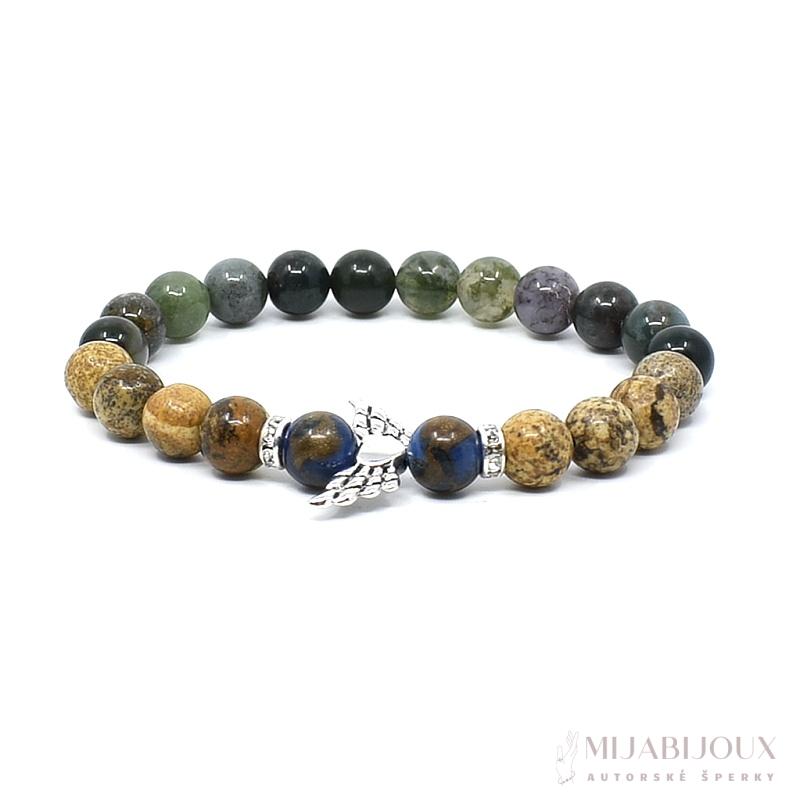 Náramek je vyroben z korálků přírodních minerálů obrázkový jaspis, indický achát a jaspis cloisonne dark blue o velikosti 8 mm. Polodrahokamy jsou navlečeny na pevném nylonovém lanku tzv. pružence o síle 0,8 mm.