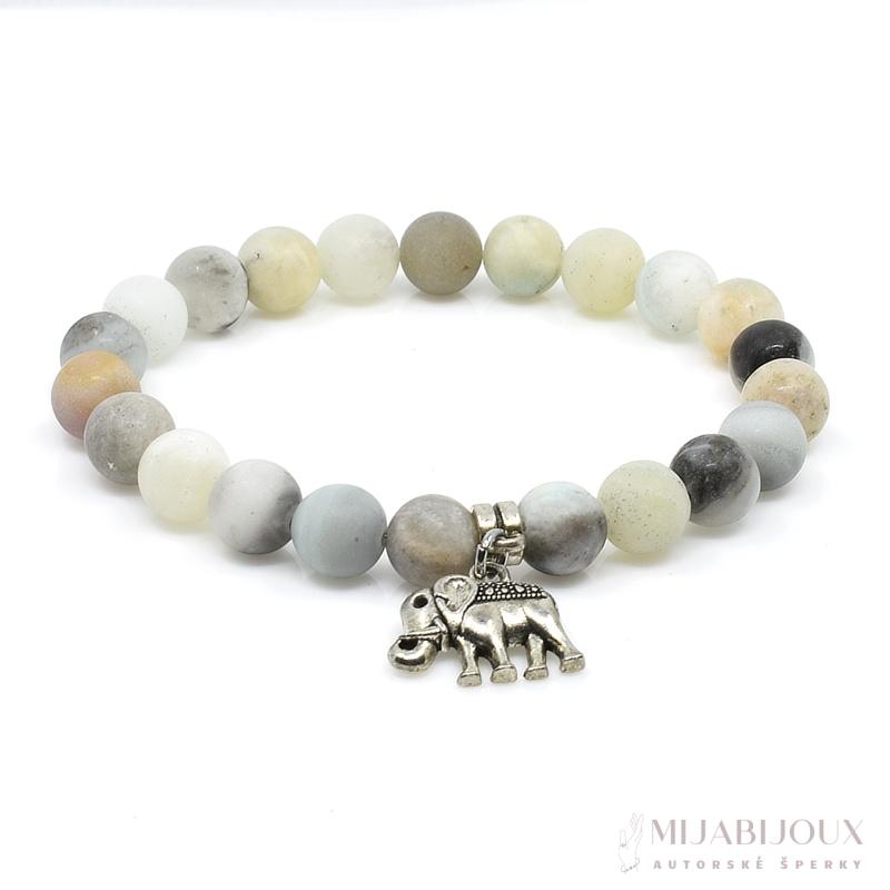 Korálky z přírodního amazonitu v matném provedení jsou navlečeny na pevnou silikonovou pruženku a dozdobeny přívěskem z bižuterního kovu ve tvaru slona.