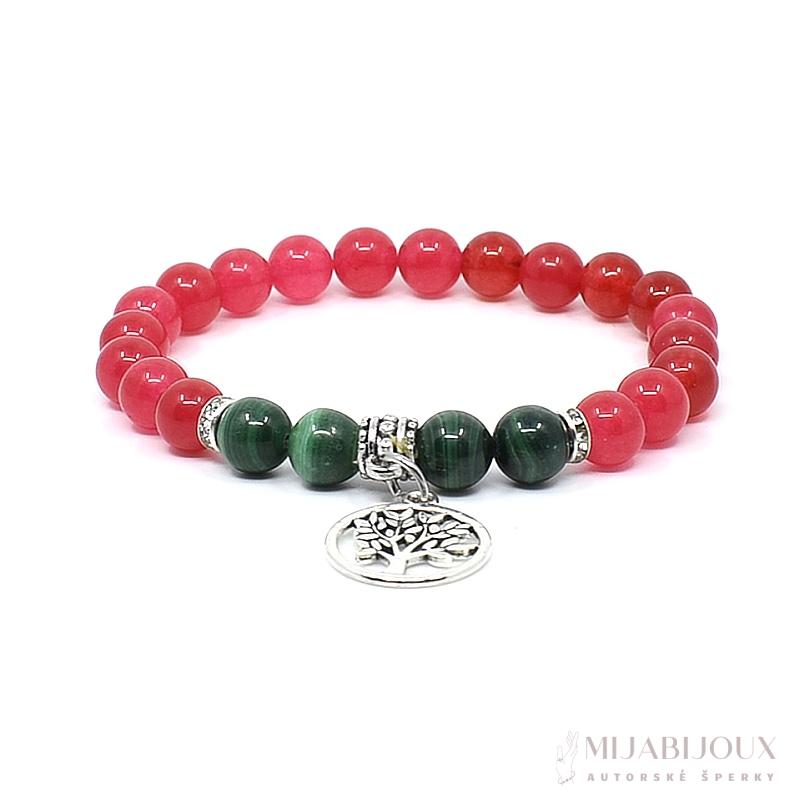Náranek tvoří korálky přírodních minerálů růžového jadeitu malaysia a přírodního malachitu o velikosti 8 mm. Korálky jsou navlečeny na kvalitní nylonové pružence.