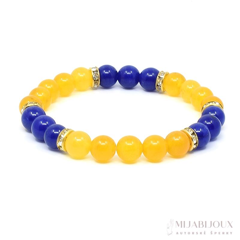 Náramek je ručně vyrobený z korálků přírodních minerálů žlutý a modrý jadeit o velikosti 8 mm. Korálky z minerálů jsou navlečeny na pevnou nylonovou pruženku.
