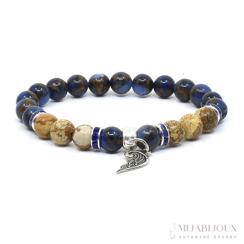 Náramek je doplněný rondelkami s modrými broušenými šatonky a přívěskem andělského křídla z bižuterního kovu.