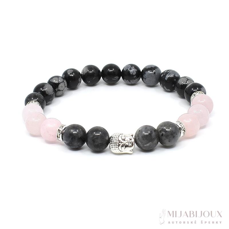 Náramek je vyroben z korálků přírodních minerálů labradorit, růženín a obsidián o velikosti 8 mm. Polodrahokamy jsou navlečeny na pevném nylonovém lanku tzv. pružence o síle 0,8 mm.