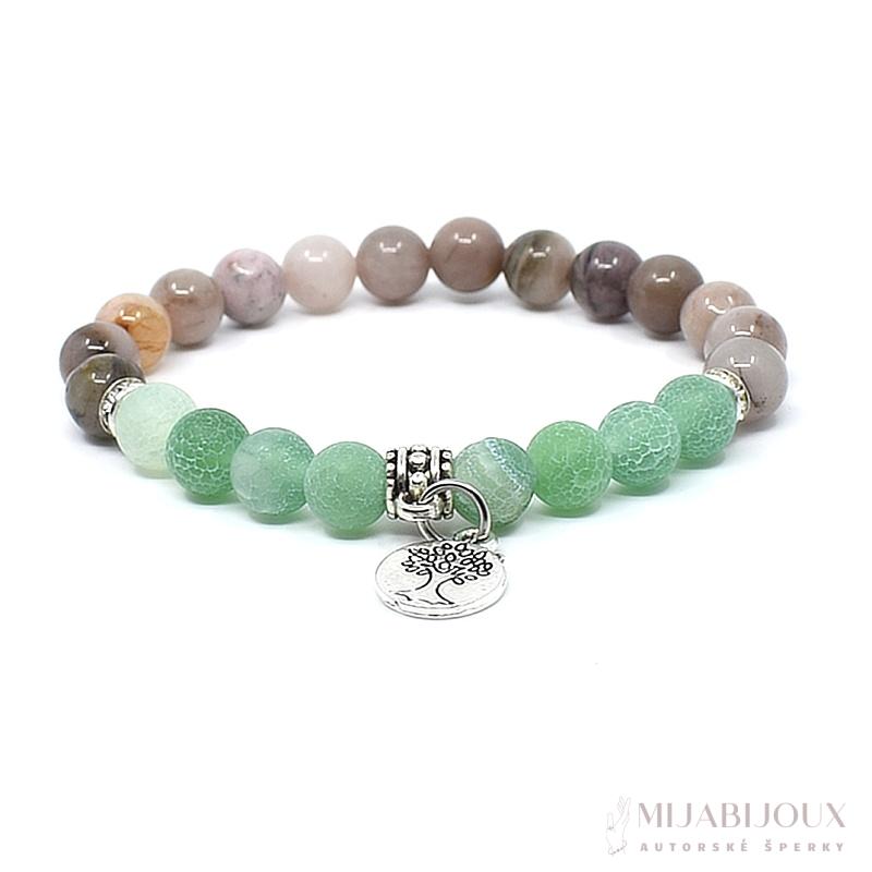 Náramek je dozdobený šatonovými rondelkami bižuterního kovu a přívěskem se stromem života.