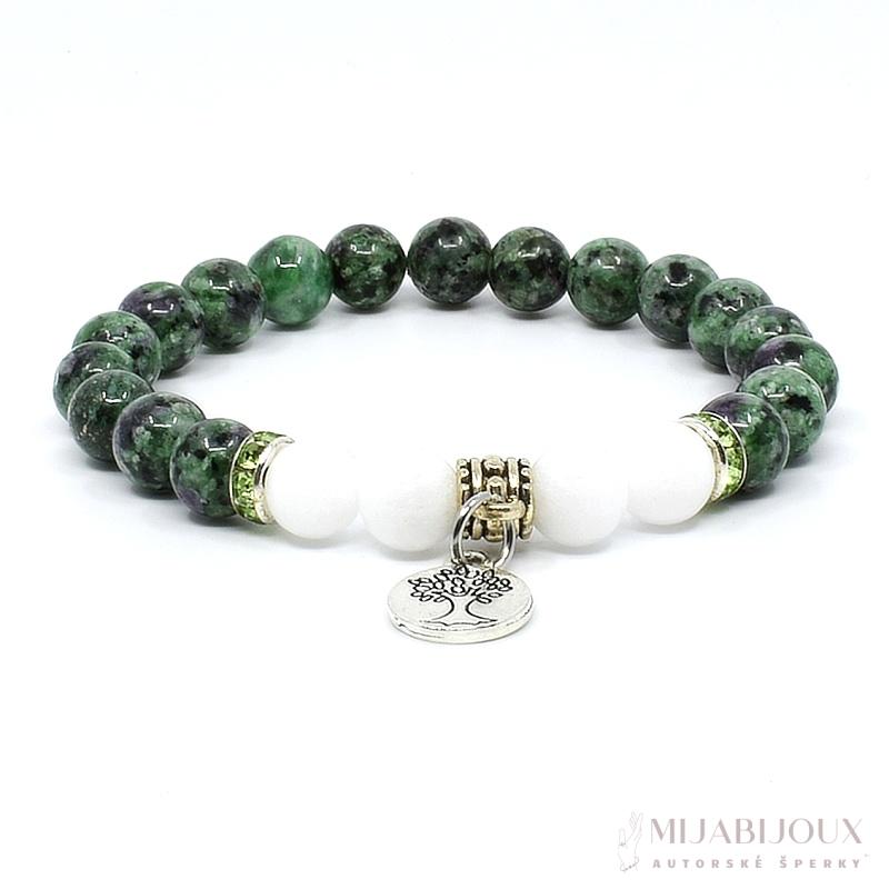 Materiálkorálky z minerálů zoisit s rubínem a bílý jadeit,bižuterní kov, nylonová pruženka