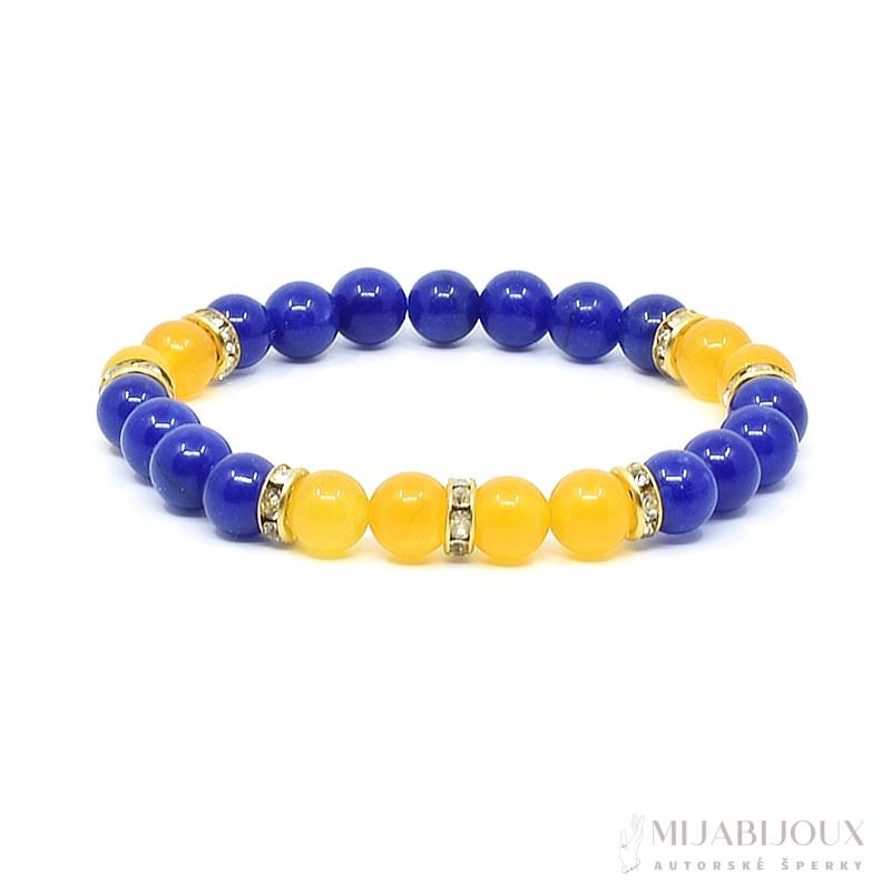 Náramek je ručně vyrobený z korálků přírodních minerálů žlutý a modrý jadeit o velikosti 8 mm. Korálky z minerálů jsou navlečeny na pevnou nylonovou pruženku.