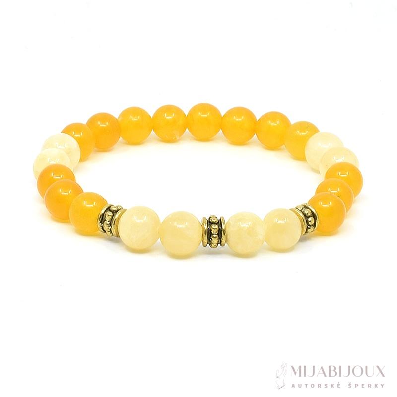 Náramek je ručně vyrobený z korálků přírodních minerálů žlutý jadeit v provedení tmavý a mléčný o velikosti 8 mm. Korálky z minerálů jsou navlečeny na pevnou nylonovou pruženku.