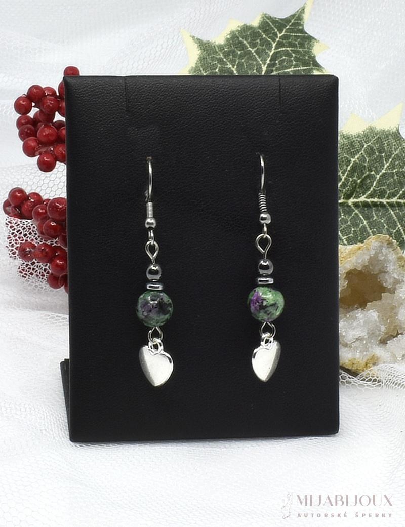 Korálky ze zoisitu a hematitu , kovový přívěsek ve tvaru srdíčka jsou navlečeny na ketlovací jehlu z chirurgické oceli a zavěšeny na afroháčky z chirurgické oceli.