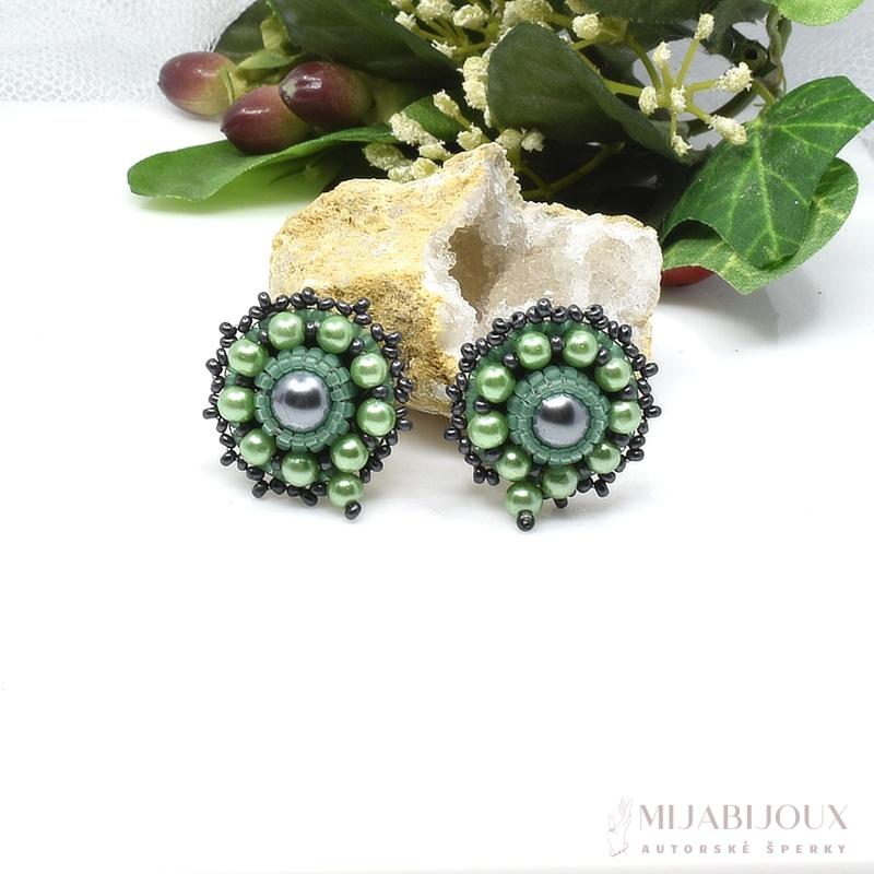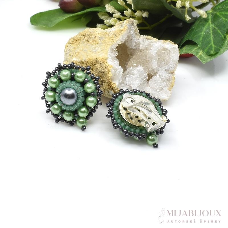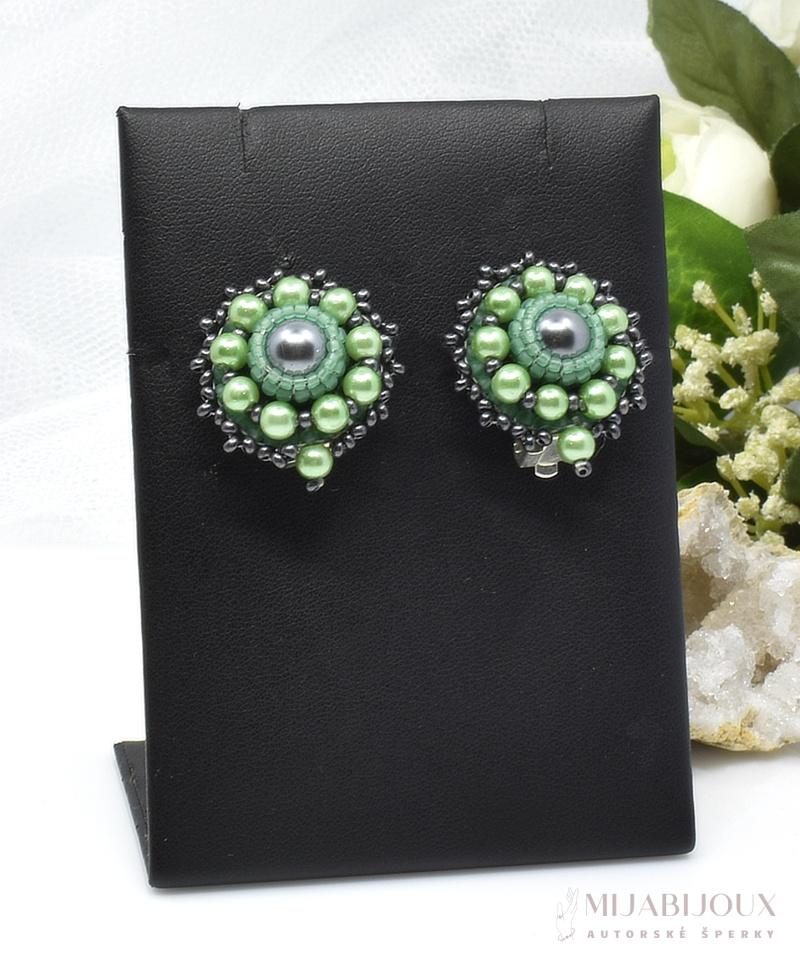 Originální ručně šité náušnice klipsy. Autorské klipsové náušnice jsou zhotoveny z skleněných voskovaných perel o velikosti 8 mm a 4 mm české výroby, japonským rokajlem Toho beads ve dvou odstínech zelené barvy.