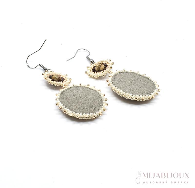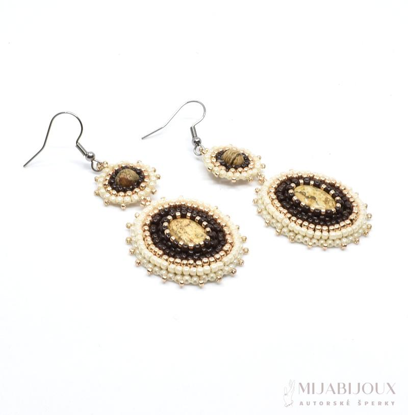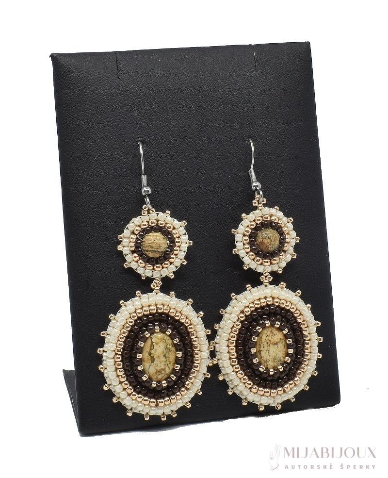 Visací náušnice vhodné pro slavnostní i denní nošení. Náušnice jsou vyrobeny technikou šití a vyšívání z korálků. Náušnice tvoří korálky a kabošony z přírodního obrázkového jaspisu, které jsou následně pečlivě obšity japonským rokajlem Toho beads v hnědé, béžové a zlaté barvě.