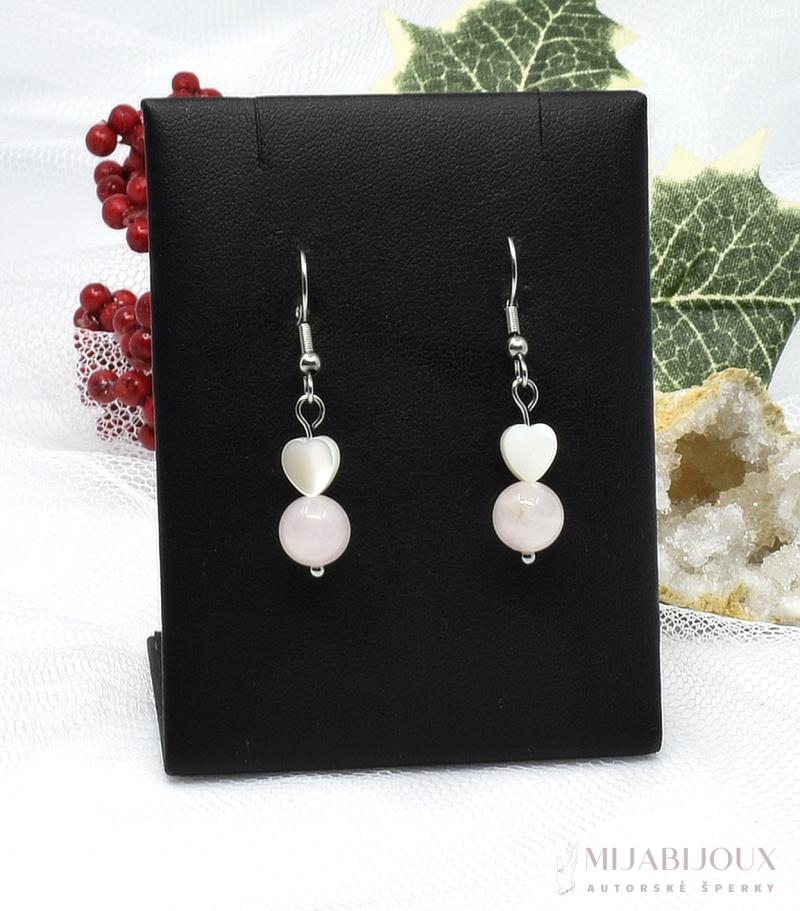 Korálky z růženínu o velikosti 8 mm, korálky ve tvaru srdíčka z pravé perleti jsou navlečeny na ketlovací jehlu z chirurgické oceli a zavěšeny na afroháčky z chirurgické oceli.