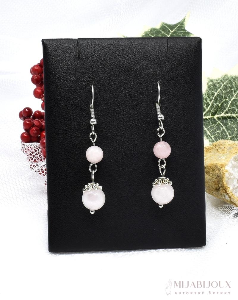 Korálky z růženínu o velikosti 8 mm a 5 mm a kaplíky z bižuterního kovu jsou navlečeny na ketlovací jehlu z chirurgické oceli a zavěšeny na afroháčky z chirurgické oceli.