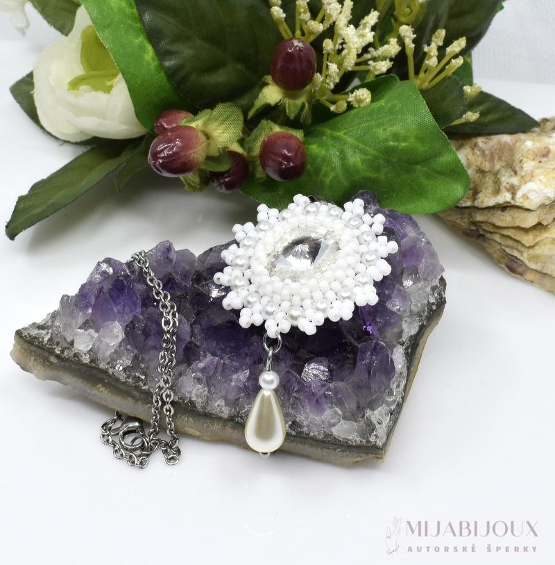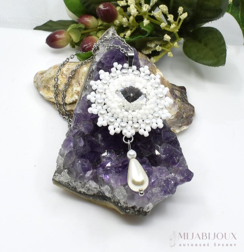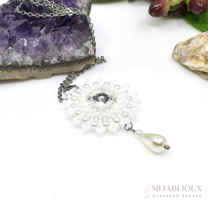 Tento ručně šitý řetízkový náhrdelník je elegantní šperk, který kombinuje luxusní Swarovski Rivoli krystal a precizní zpracování. Přívěsek tvoří jasný Swarovski Rivoli krystal který je středobodem designu. Kolem rivolky šperku jsou bílé korálky Toho rokajl a skleněné voskované perly, které svým provedením připomínají sněhovou vločku, což dodává přívěsku kouzlo a eleganci.