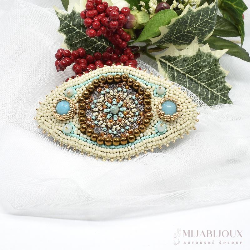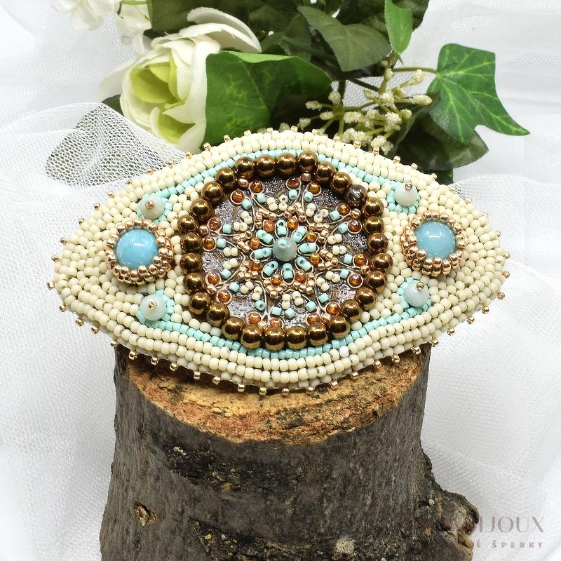 Jedinečná spona do vlasů s filgránem a korálky z amazonitu. Spona je vytvořená technikou korálkové výšivky. Na filcový podklad je pomocí korálků přišitý krásný filigrán v barvě mědi. Kolem filidránu jsou našity skleněné voskové perličky české výroby, korálky z přírodního amazonitu a japonský rokajl Toho Round v barvě béžové a permanentí zlaté a rokajlem Myiuky Delica ve světle tyrkysové barvě.